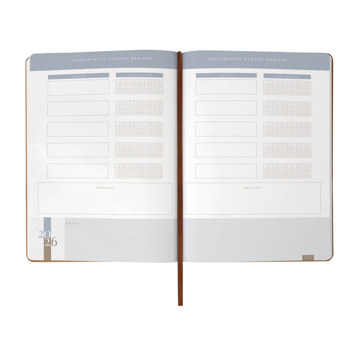 Agenda diaria con 174 hojas. Contiene datos personales, calendarios 2025-2026-2027, planeador 2026, seguimiento de nuevos hábitos y días festivos. Incluye caja individual.