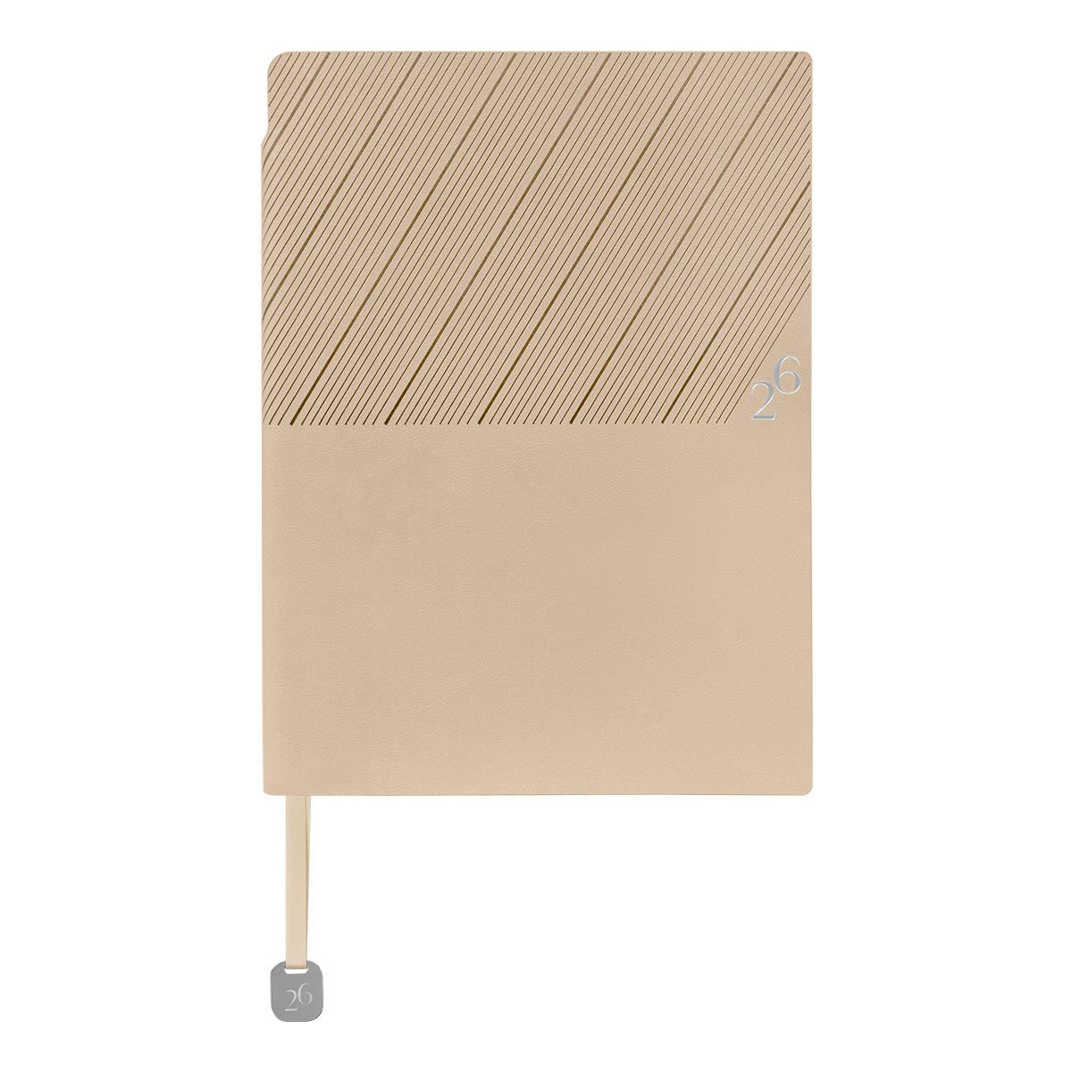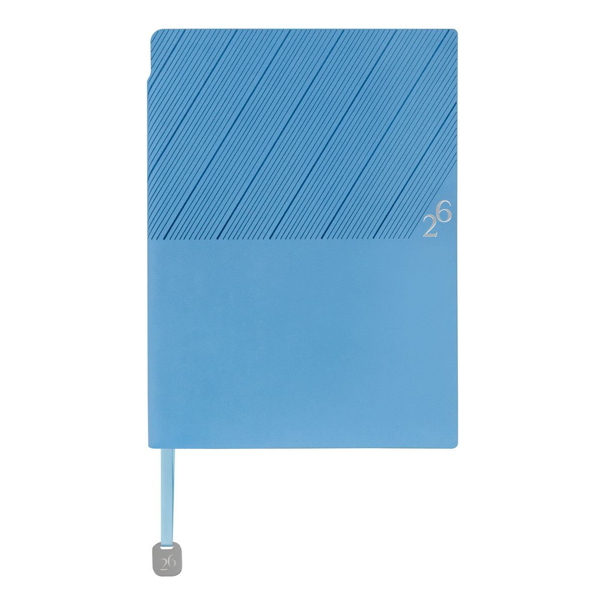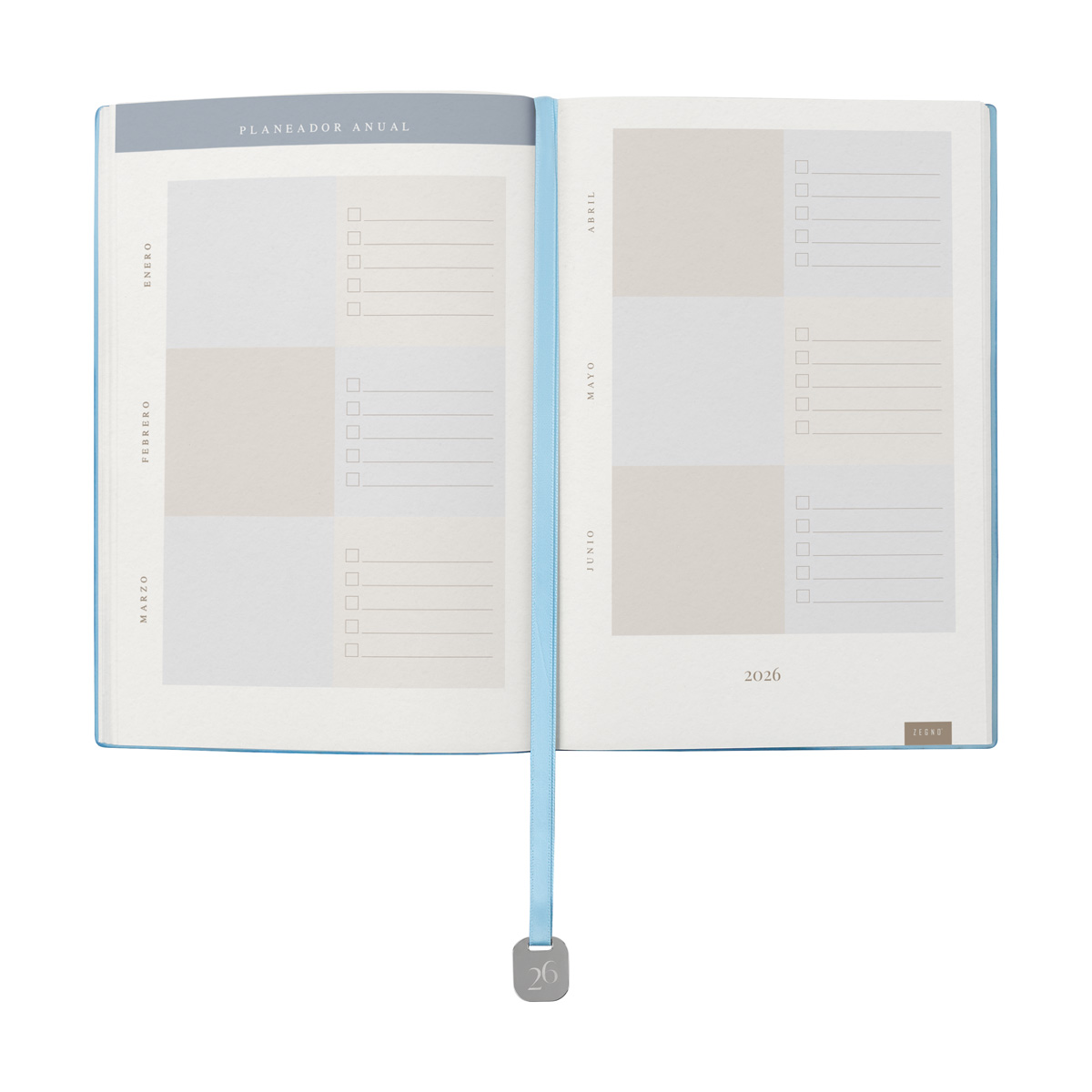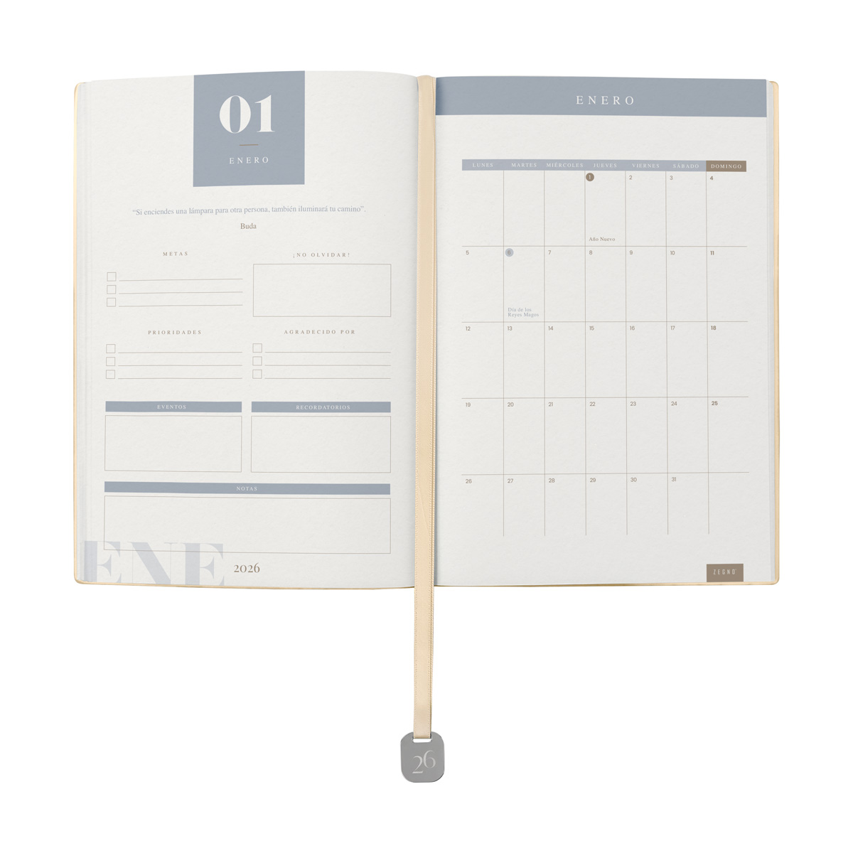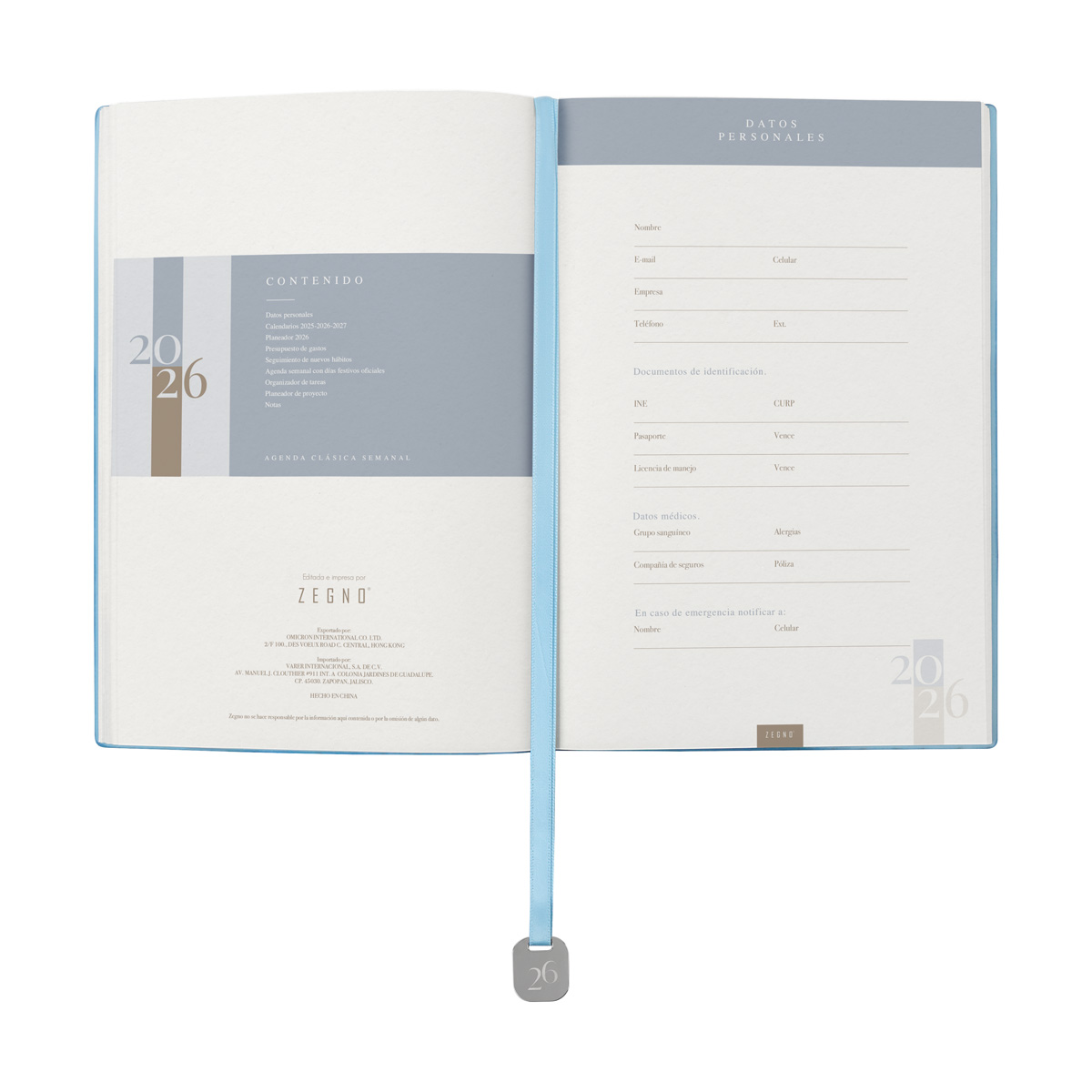 Agenda semanal con 100 hojas. Contiene datos personales, calendarios 2025-2026-2027, planeador 2026, presupuesto de gastos, seguimiento de nuevos hábitos, organizador de tareas, planeador de proyectos y días festivos. Incluye caja individual del mismo color a la agenda, separador con placa metálica y bolígrafo.