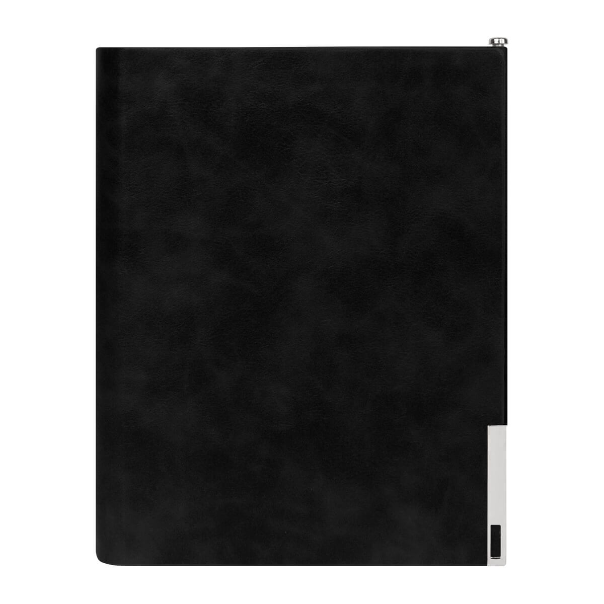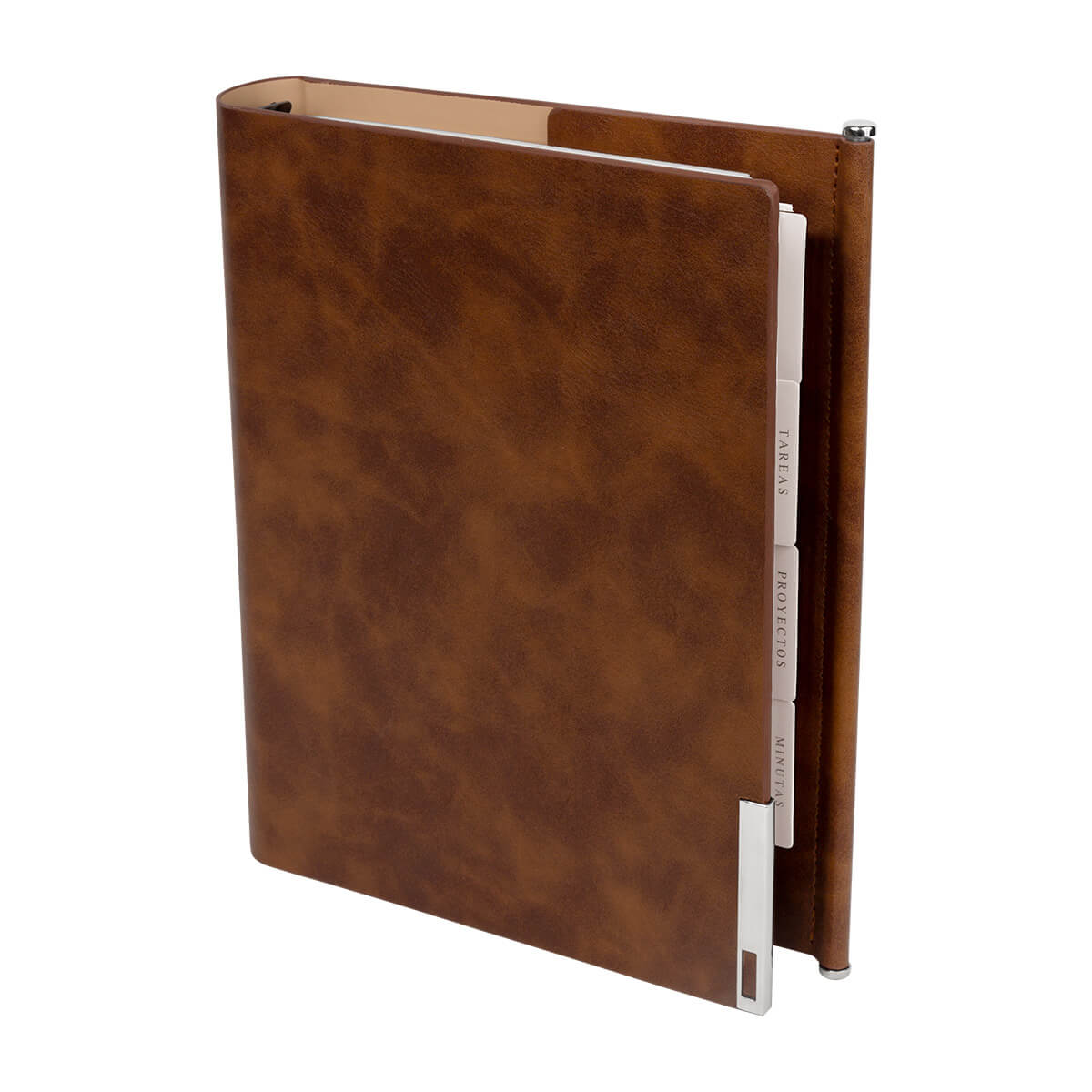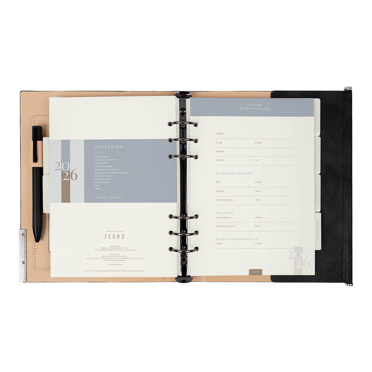 Agenda semanal con 140 hojas. Contiene datos personales, calendarios 2025-2026-2027, planeador 2026, presupuesto de gastos, seguimiento de nuevos hábitos, organizador de tareas, planeador de proyectos y días festivos. Incluye 7 secciones de separador de cartón, 3 hojas con stickers, bolígrafo metálico y caja individual tipo regalo.