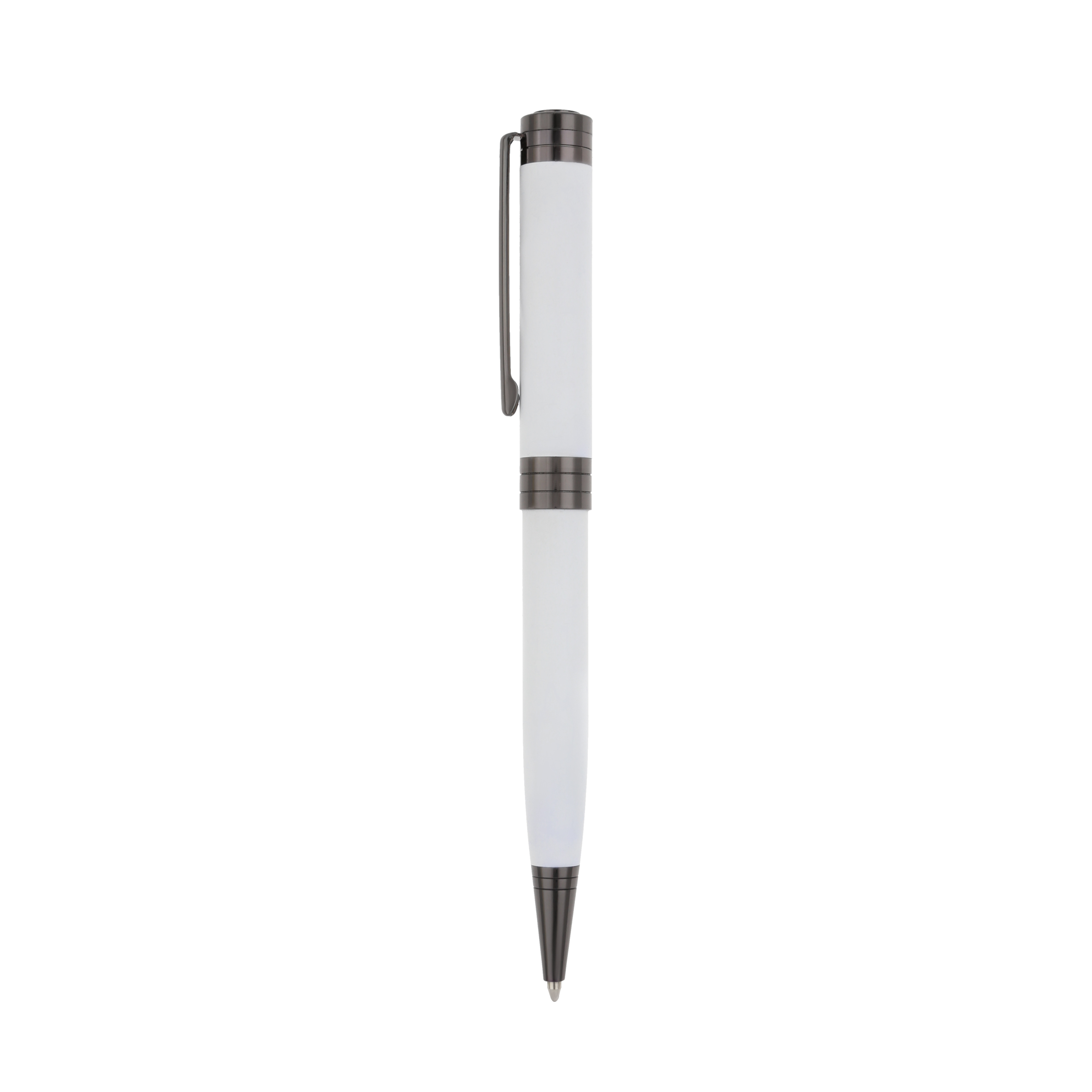 Bolígrafo metálico con clip, detalles en color negro en el cuerpo y mecanismo retráctil.