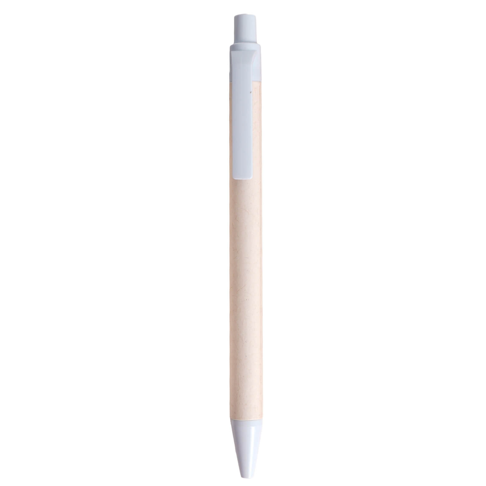 Bolígrafo ecológico fabricado a partir de cartones de leche reciclados. Cuenta con clip y mecanismo de click.