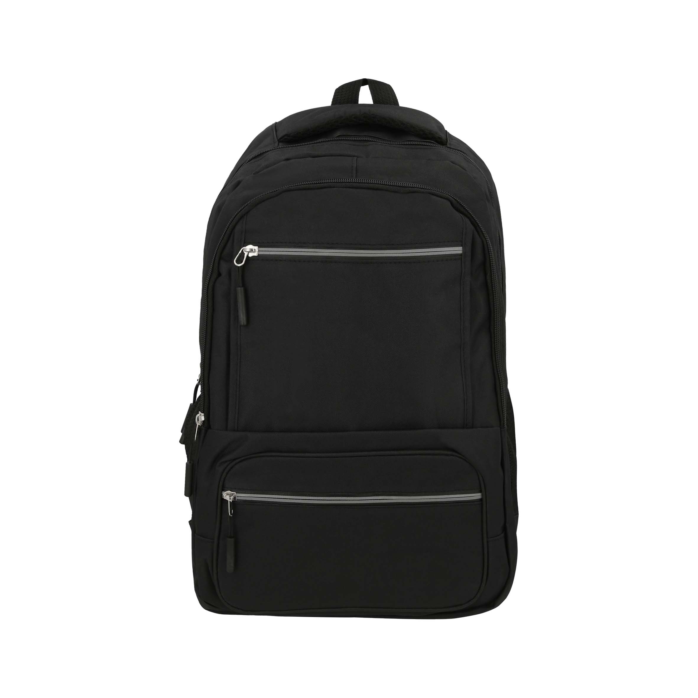 Mochila con 4 compartimentos, 1 compartimento principal con apartado para laptop de 19″, 3 compartimentos frontales y 2 bolsas de malla laterales.