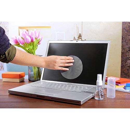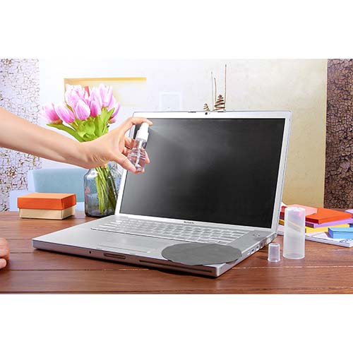 Atomizador con líquido limpia pantallas y microfibra de 12.5 cm de diámetro. El atomizador y la fibra se entregan por separado para su impresión.