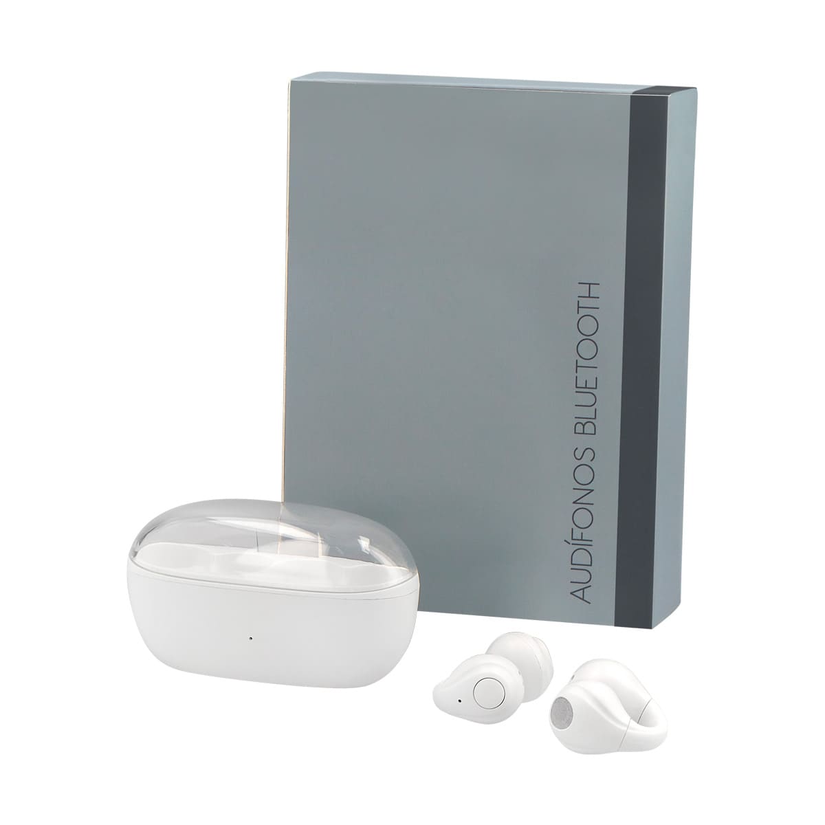 Audífonos con tecnología bluetooth 5.3. Incluye estuche con base recargable, controles touch integrados para reproducción de música y función de llamada. Reproducción de música 3 a 4 horas, rango de conexión de 10 metros. Tiempo de carga 1 hora aproximadamente. Batería de 30mAh (audífonos) y 250mAh (estuche). Cable de carga tipo C y caja individual.
