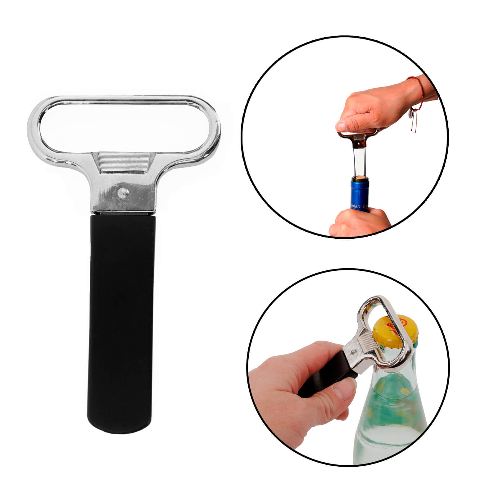 Sacacorchos y destapador de laminas con funda de plástico.