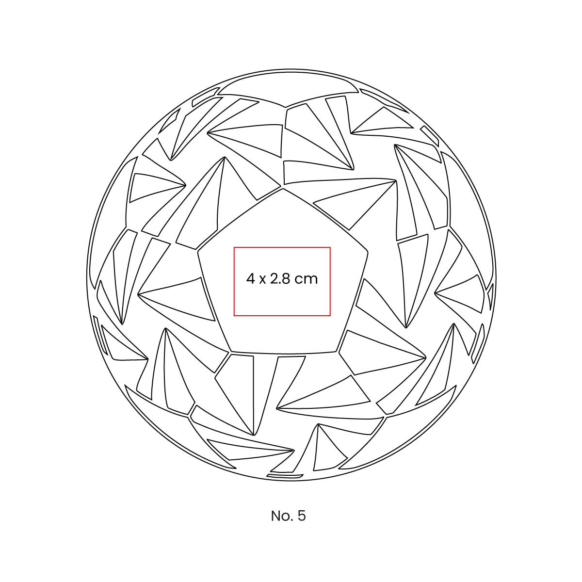 Balón de fútbol No. 5 con 35 gajos. Peso 400 gr. Cosido a máquina. Nivel máximo de presión 6-8 psi. Capa especial de PVC.