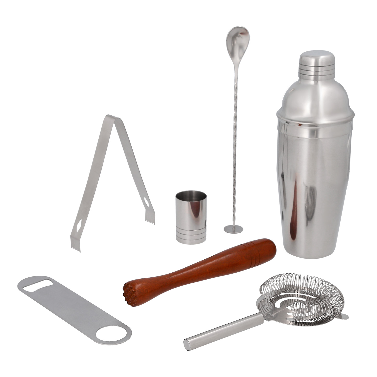 Set de coctelería. Incluye 8 accesorios: funda, shaker, medidor, cucharilla, mortero, destapador, pinzas y colador / mezclador.