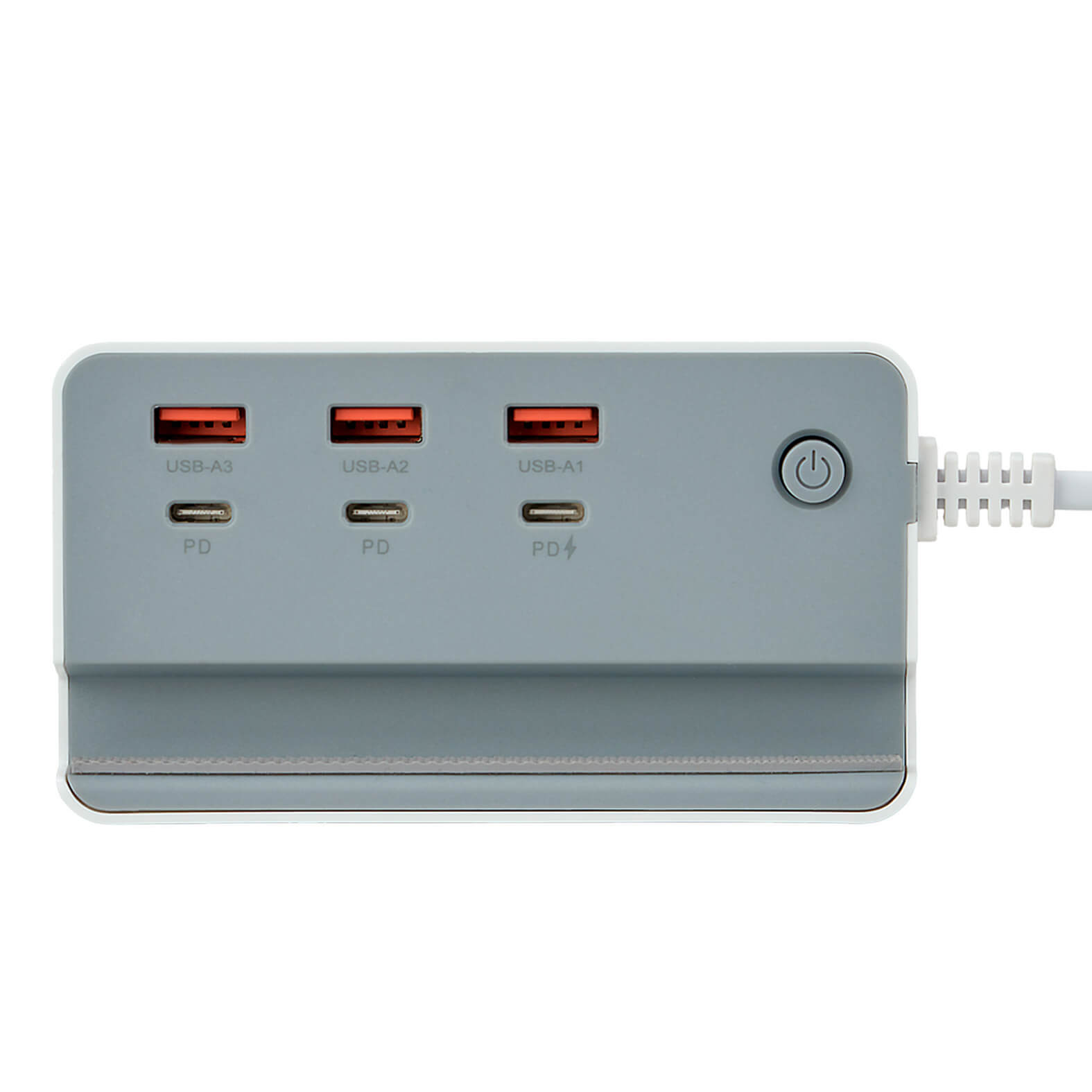 Concentrador de plástico con tres puertos USB, tres puertos Tipo C, botón de encendido/apagado y cable de conexión universal.
