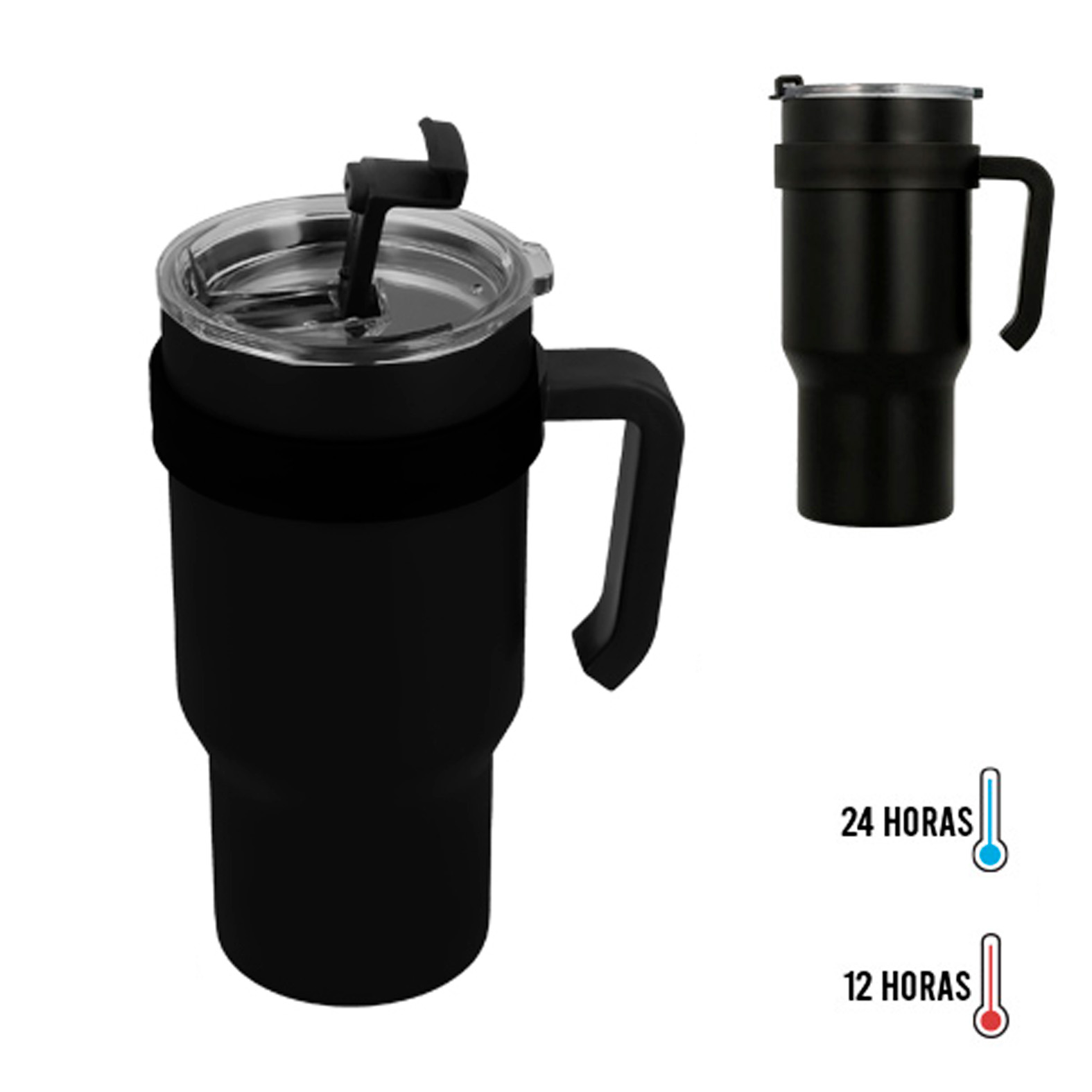Termo de acero inoxidable de doble pared insulado al vacío, cuenta con asa lateral para mayor comodidad y tapa de cierre a presión.