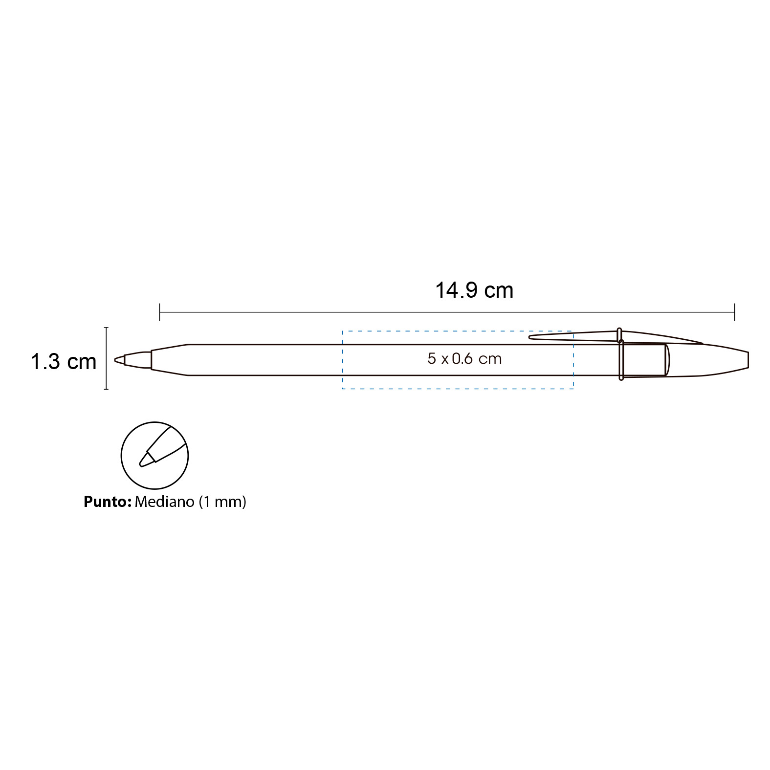 Bolígrafo de plástico sólido de punto medio (1 mm), con tapa y tinta azul. La compra mínima es de 300 piezas y no se realizan ventas sin impresión.
