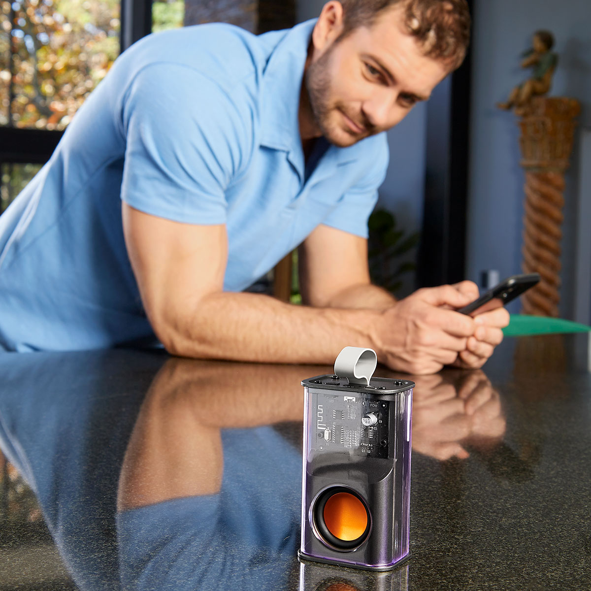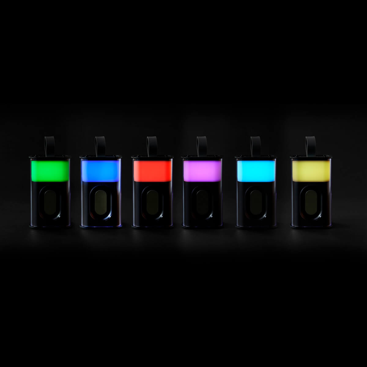 Bocina bluetooth recargable. Luz RGB con 7 efectos diferentes. Reproducción de música por 3 horas aproximadamente. Tiempo de carga 2-3 horas. Alcance de conexión de 10 metros. Batería de 500 mAh. Conexión tipo C. Incluye cable auxiliar y asa de silicón para transportarla fácilmente.