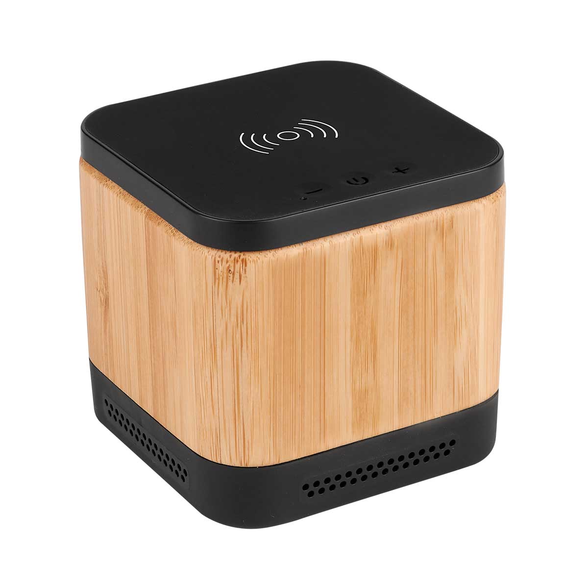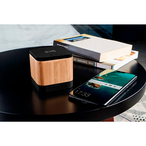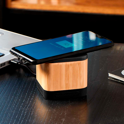 Bocina bluetooth con batería recargable. Reproducción de música de 2 hrs aproximadamente. Controles integrados de llamadas, volumen y reproducción de audio. Rango de conexión de 10 metros. La base al estar conectada, funciona como cargador inalámbrico de smartphone. Incluye cable cargador USB.