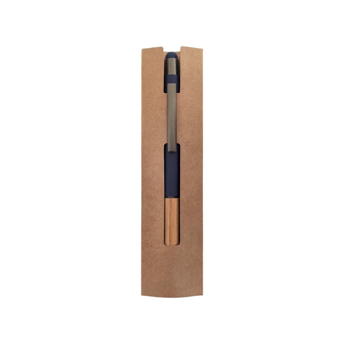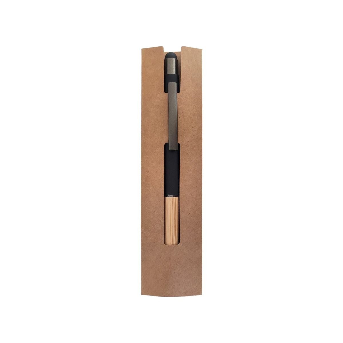 Bolígrafo con touch screen y grip de bambú. Terminado rubber. Mecanismo pulsador. Incluye funda.