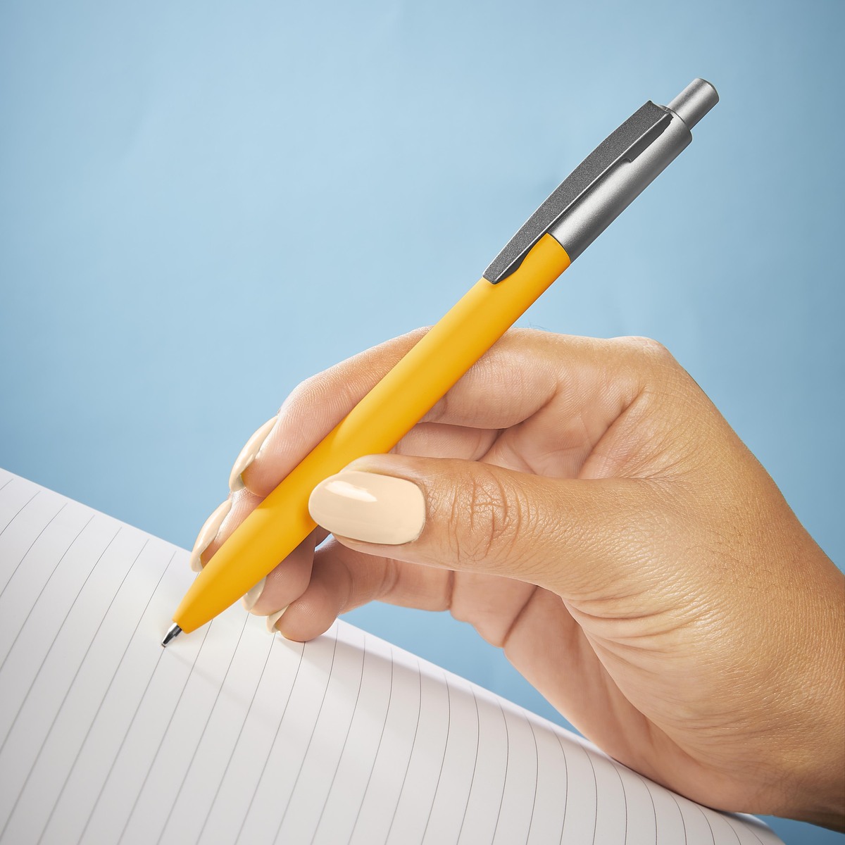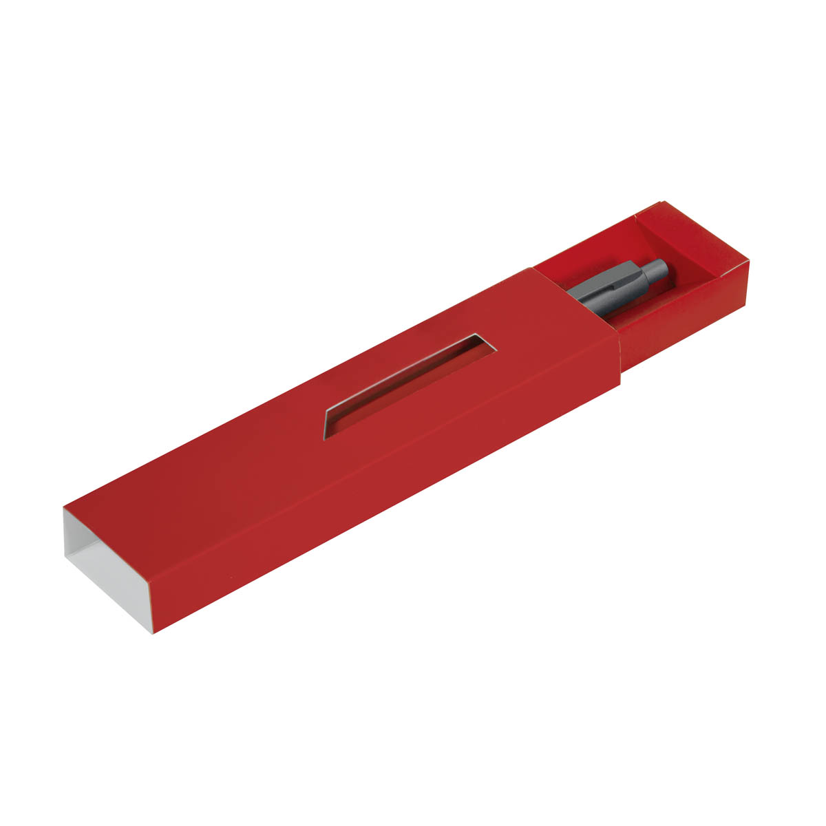 Bolígrafo metálico con terminado mate. Mecanismo pulsador. Incluye estuche de color a tono con el bolígrafo.