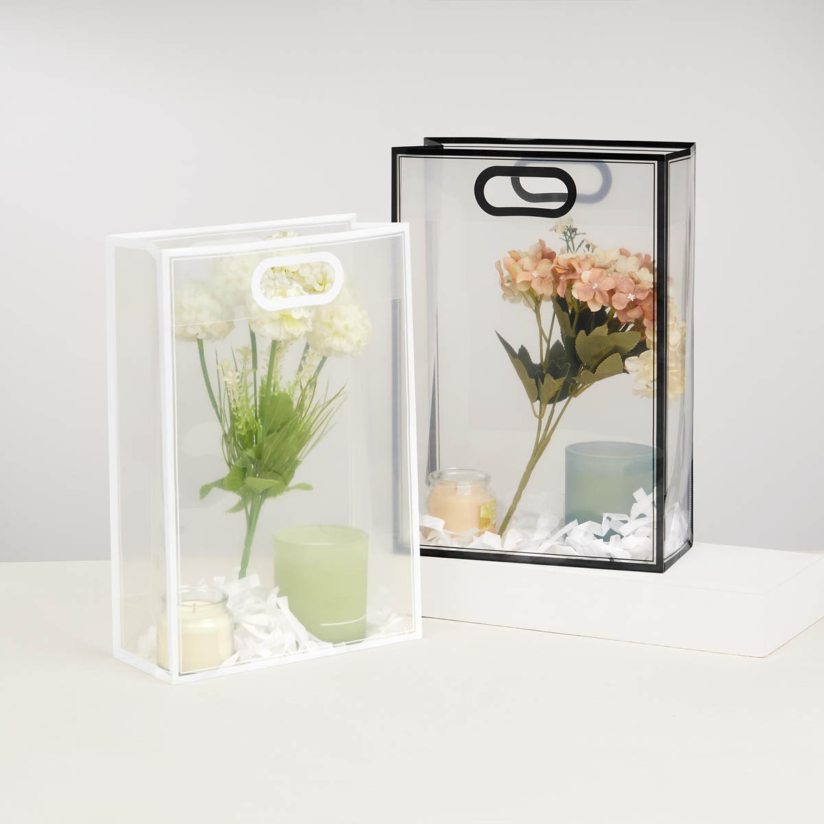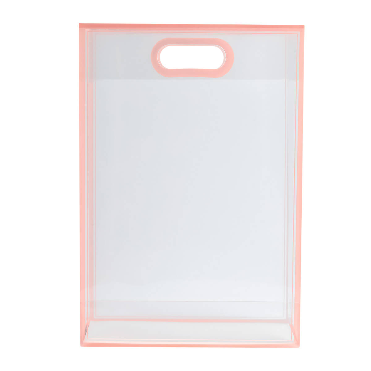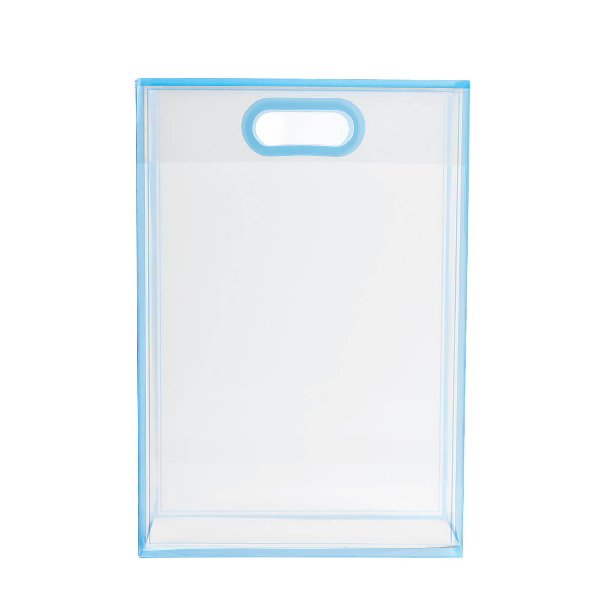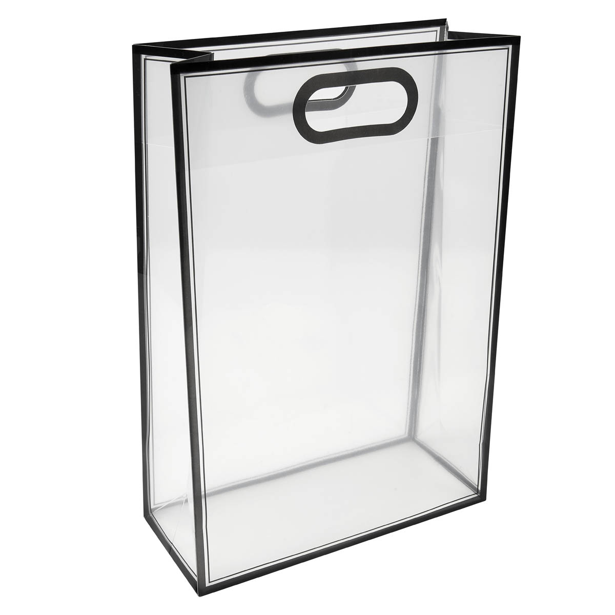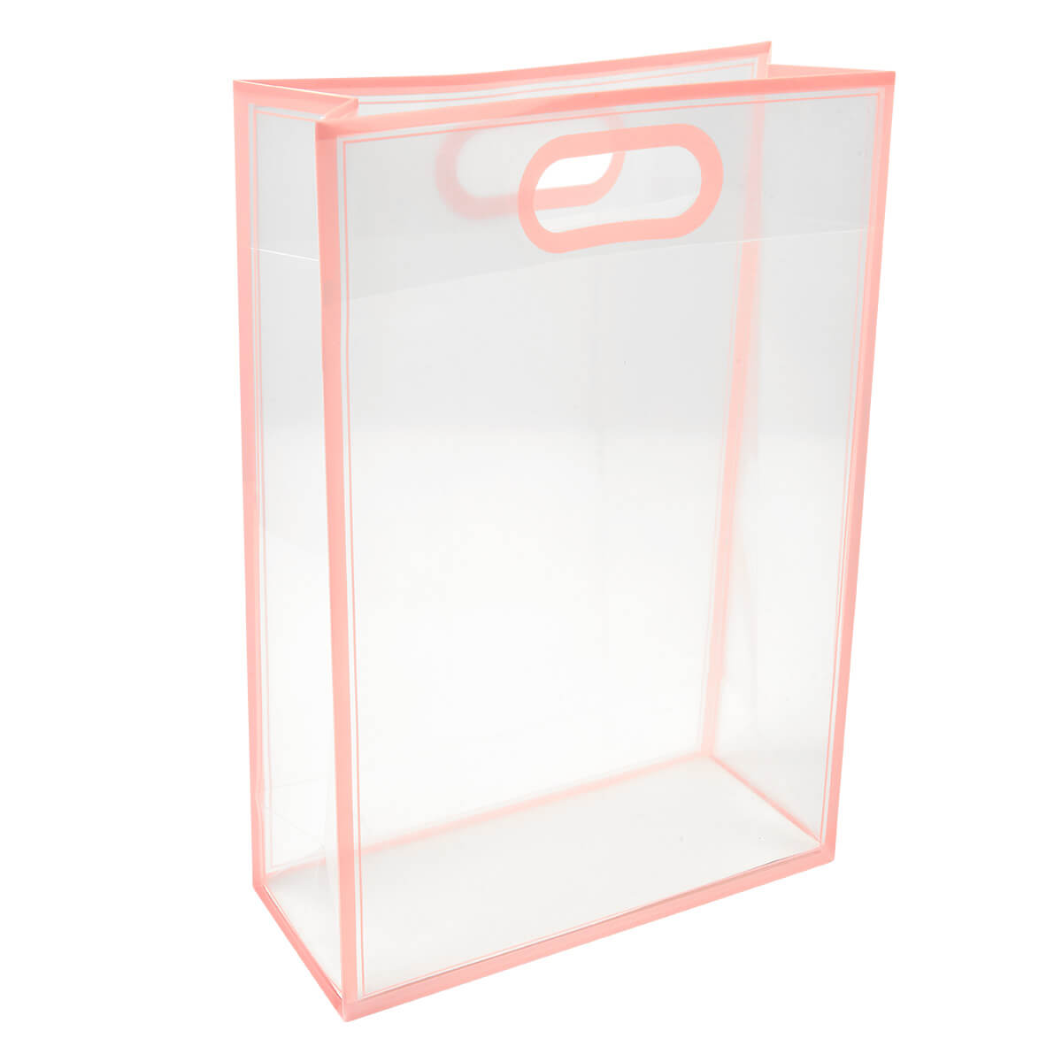 Bolsa de PVC con fuelle. Su diseño transparente con bordes de color la hace ideal para crear tus propios sets de regalo. Su asa está diseñada para llevarla cómodamente con una sola mano. Perfecta para cualquier ocasión especial.
