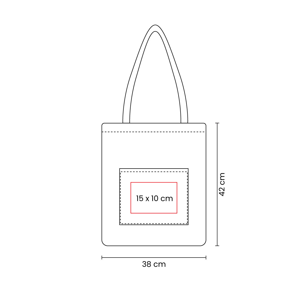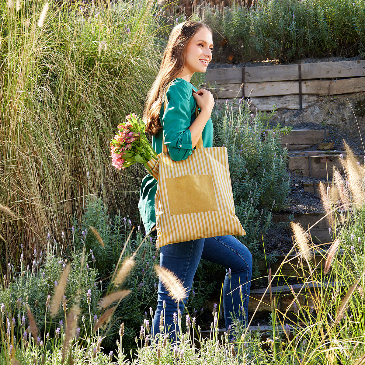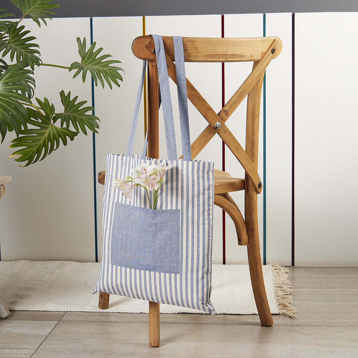 Bolsa ecológica de algodón reciclado. Sin fuelle. Incluye bolsillo frontal. Estampado de rayas.