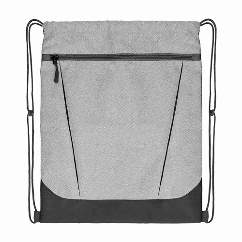 Bolsa-mochila gris, material jaspeado, bolsillo frontal con cierre, con tirantes de cordón y cerrado de jareta.