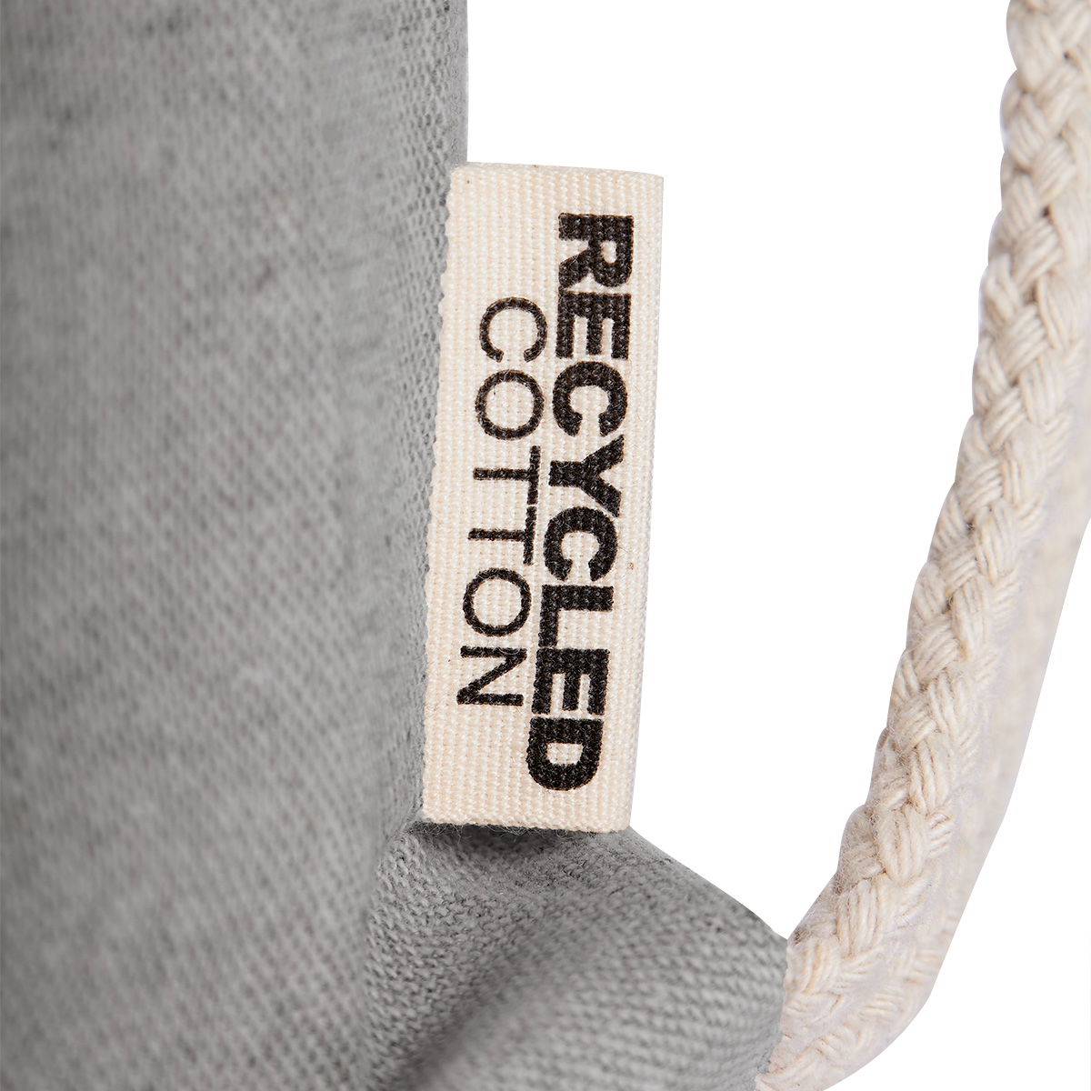 Bolsa-mochila gris ecológica de algodón reciclado con tirantes de cordón y cerrado de jareta. Cuenta con una bolsa frontal y asas para usar como bolsa.