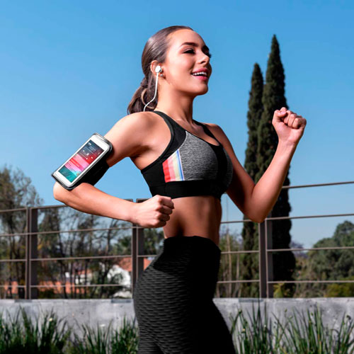 Brazalete deportivo para smartphone de medida hasta 8 x 15 cm, lo protege del polvo y humedad. Cuenta con mica transparente compatible con pantallas touch, contorno reflejante para escenarios de poca luz, 4 orificios para audífonos, correa con broche velcro y bolsillo porta llave.