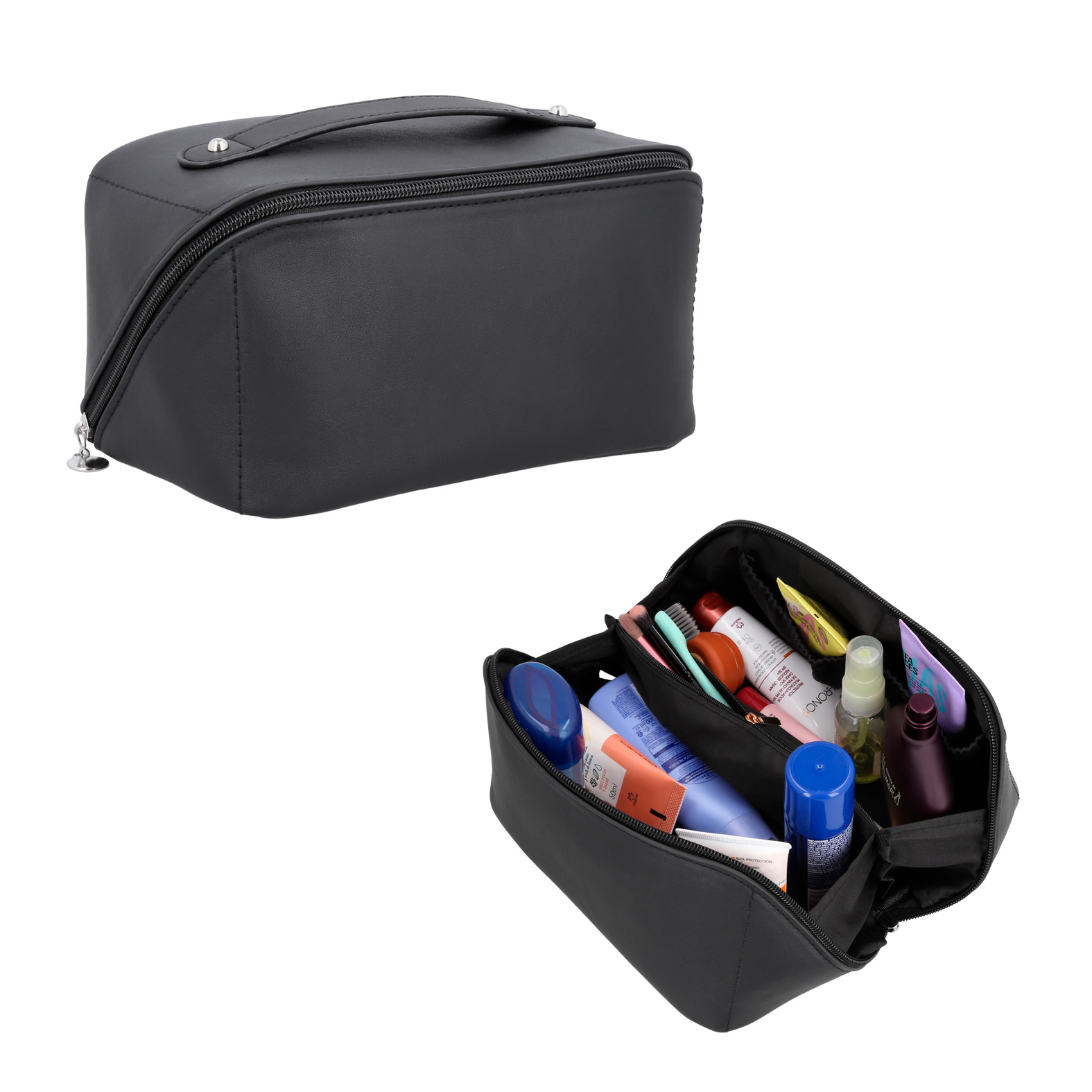 Neceser de curpiel con 1 compartimento principal, 4 compartimentos internos y asa.