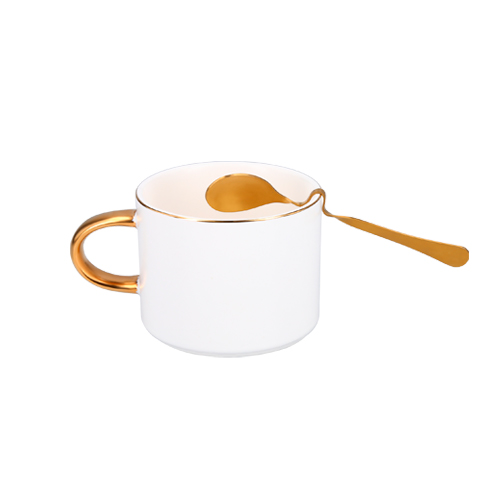 Taza de cerámica con cuchara de acero inoxidable para sujeción en el borde.