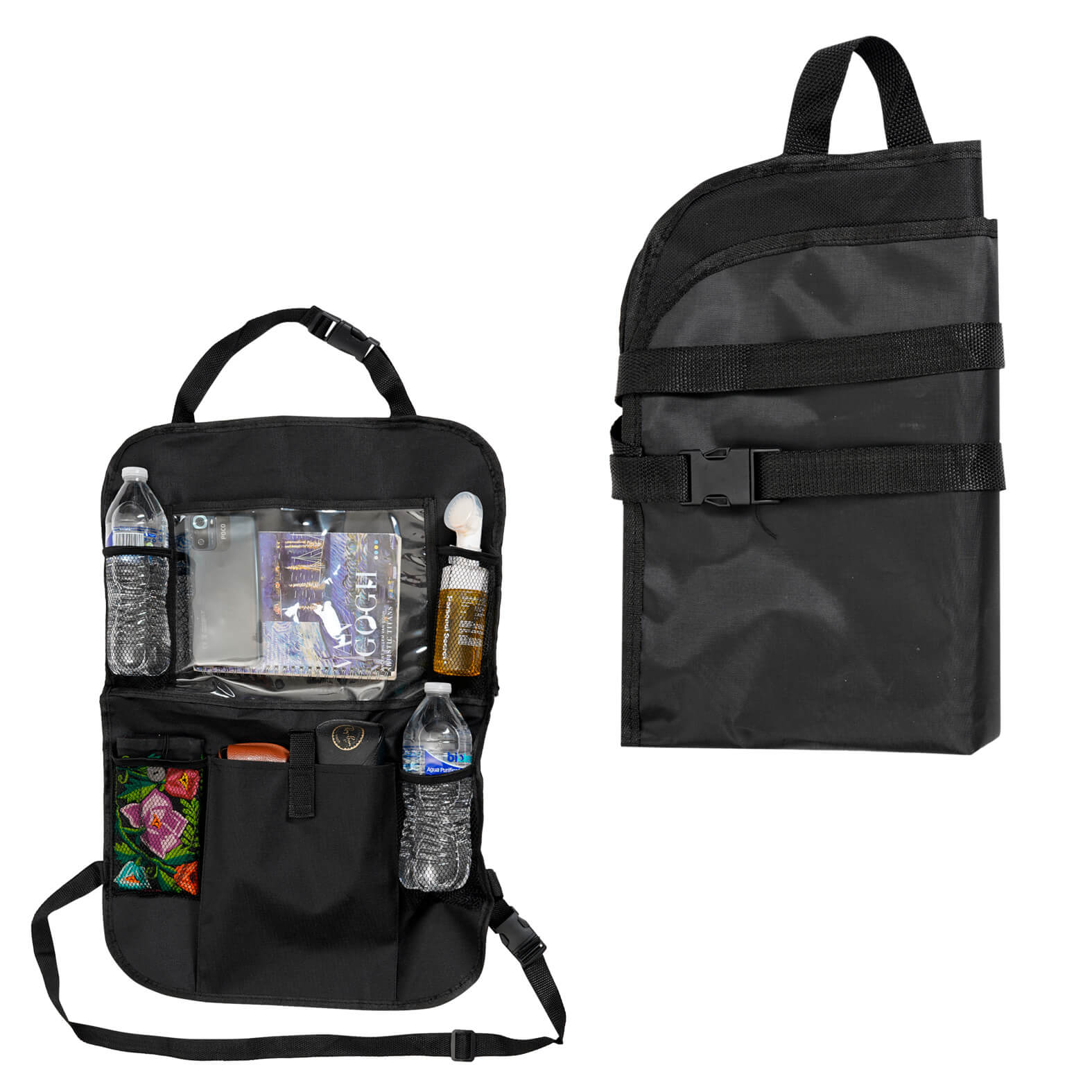 Organizador para asiento de auto, con cuatro bolsillos de malla, un bolsillo con broche de velcro y un bolsillo transparente para tablet o celular. Cuenta con correas ajustables de broche.