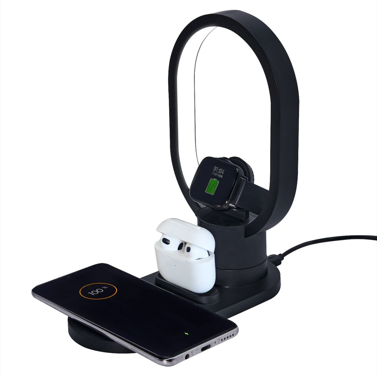 Base con cargador inalámbrico para smartphone, cargador inalámbrico para reloj inteligente, cargador para earbuds y lámpara de noche con luz cálida. Velocidad de carga de 5W / 7.5W / 10W / 15W. Base giratoria con touch para encender la lámpara. Compatibles con dispositivos que cuenten con tecnología de carga inalámbrica.