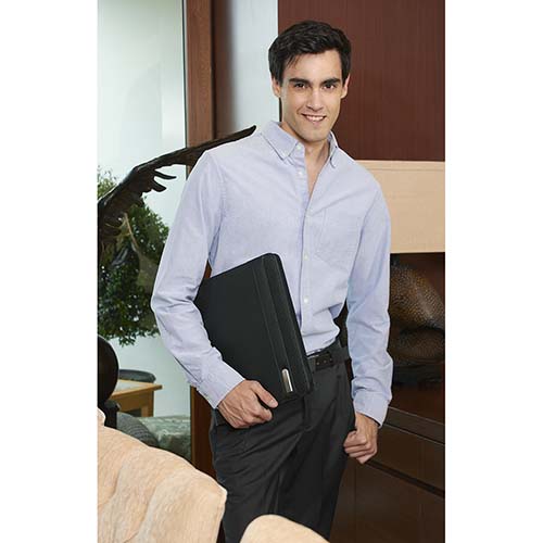 Carpeta con cierre y placa metálica. Incluye block de raya tamaño A4 con 20 hojas. Incluye elástico para bolígrafo, compartimento para smartphone y tarjetas. No incluye bolígrafo.