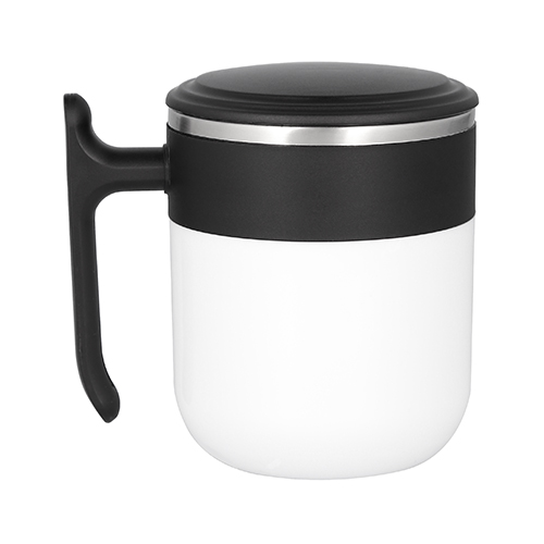 Termo de doble pared con interior de acero inoxidable y exterior de plástico, tapa de cierre a presión y asa de plástico.