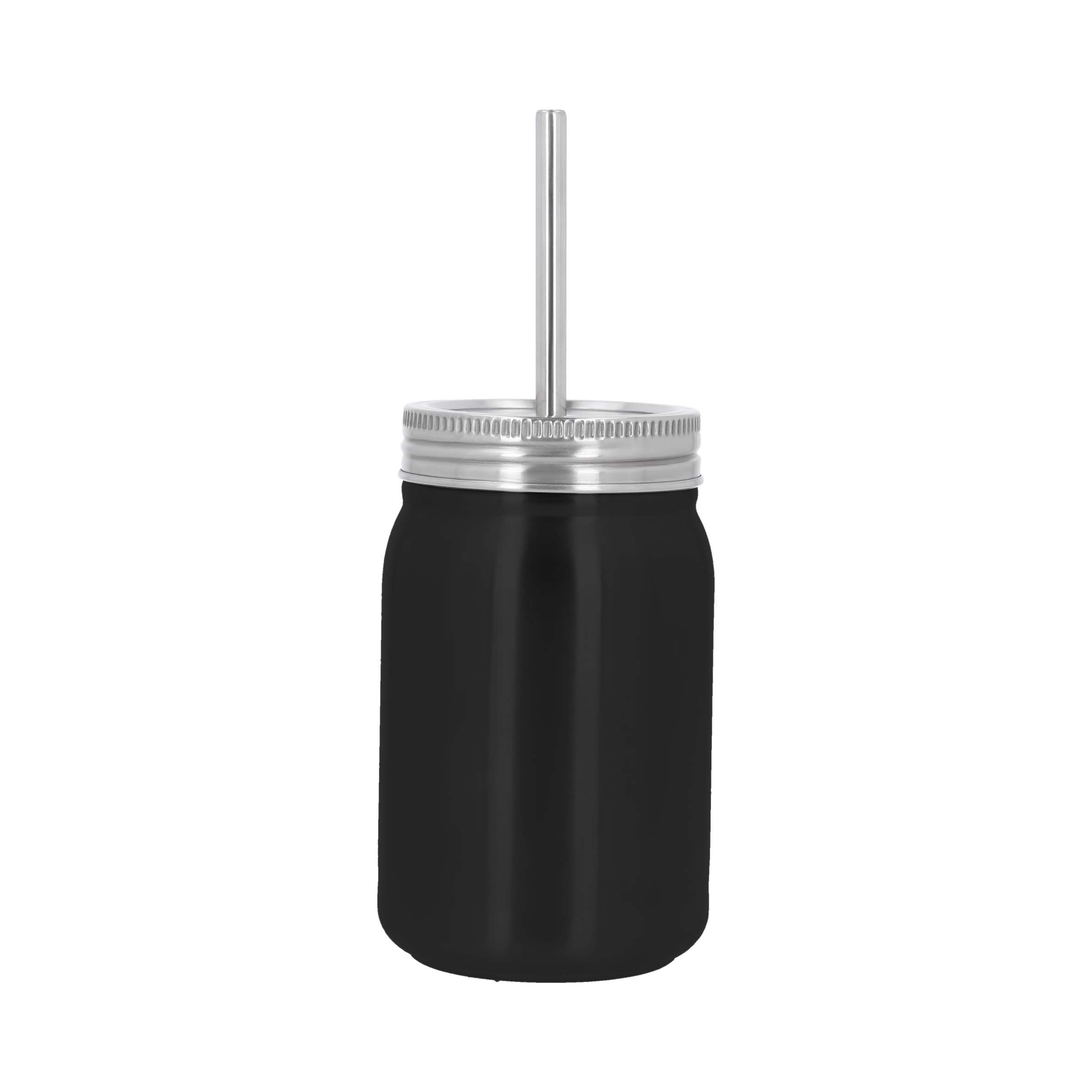 Tarro con doble pared de acero inoxidable, insulado al vacío con tapa de rosca y popote metálico.