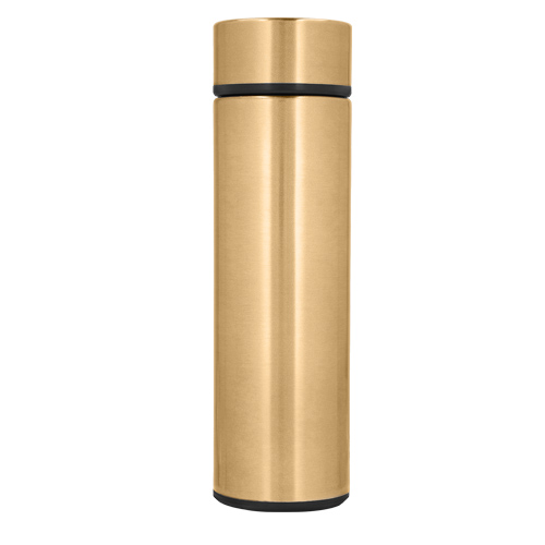 Termo con doble pared de acero inoxidable con termómetro digital que mide la temperatura de tu bebida, colador metálico y tapa enroscable. Incluye batería.