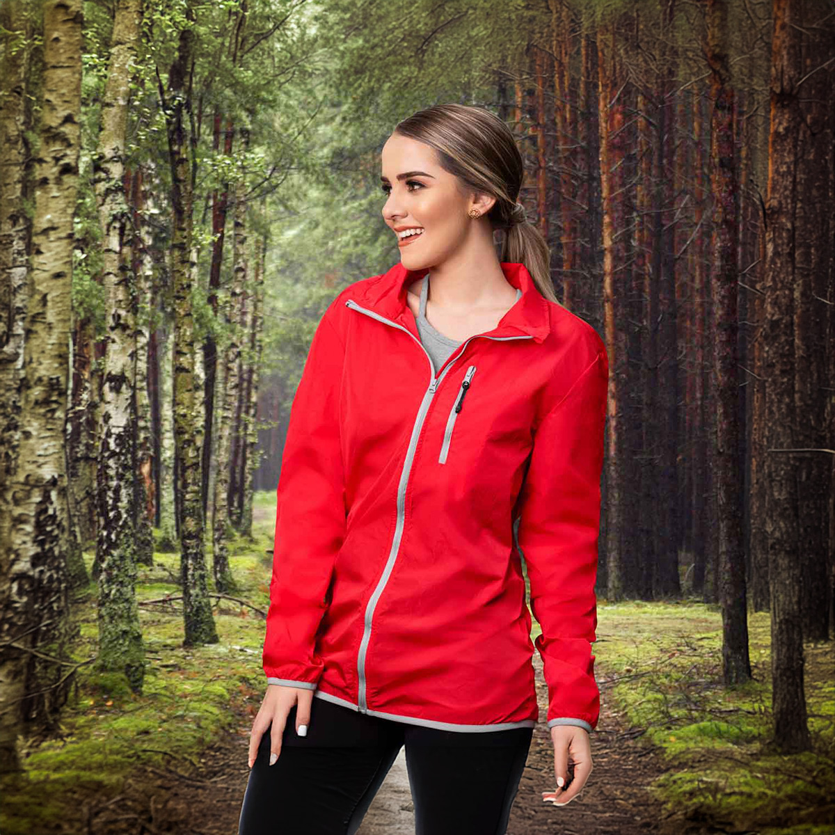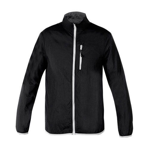 Chamarra deportiva ligera plegable con funda en cierre. 100% Poliéster.