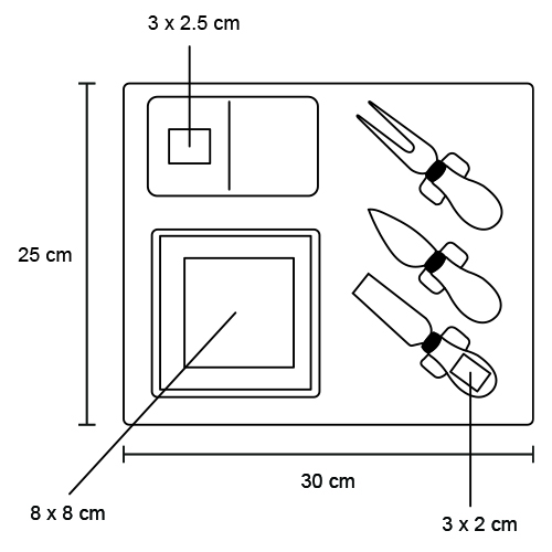 Tabla de quesos que incluye mini plato de cerámica doble, 1 cuchillo de avión estrecho, un cuchillo y un tenedor.