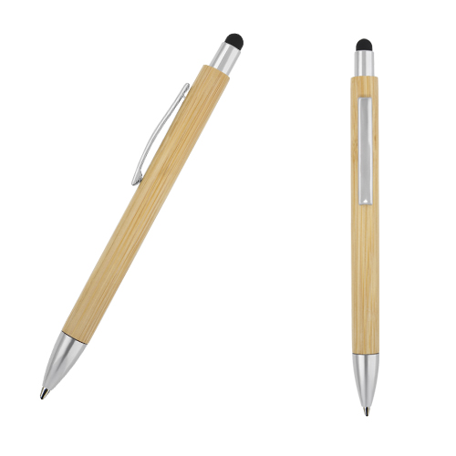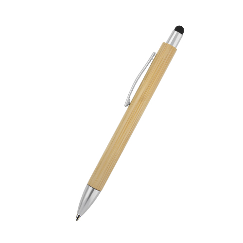 Bolígrafo de bambú con clip y punta metálica, goma touch screen y mecanismo de click.