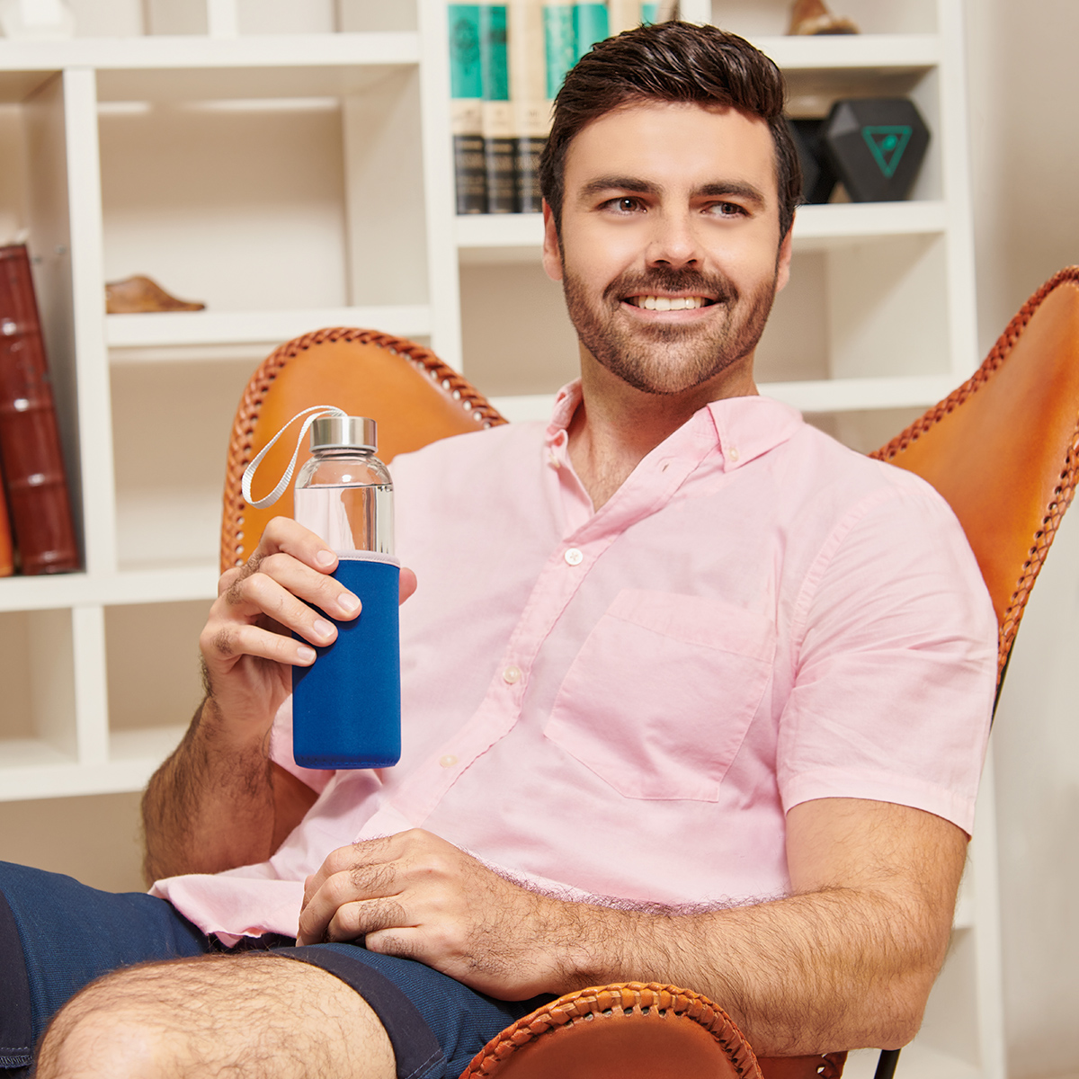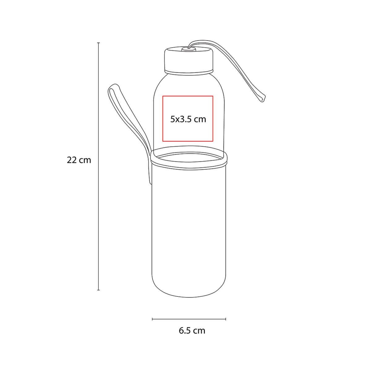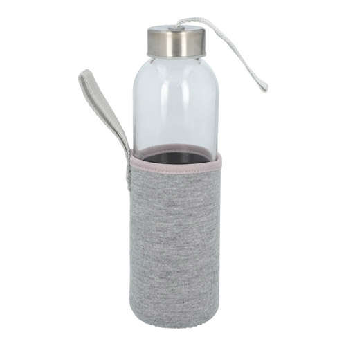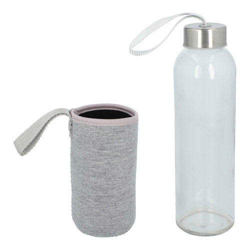 Cilindro de vidrio con tapa metálica de rosca con jareta de tela y funda removible de neopreno con asa que no permite transferir calor de las manos o del ambiente a la bebida.