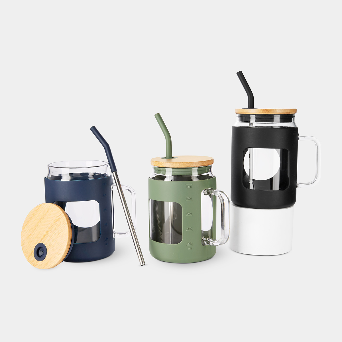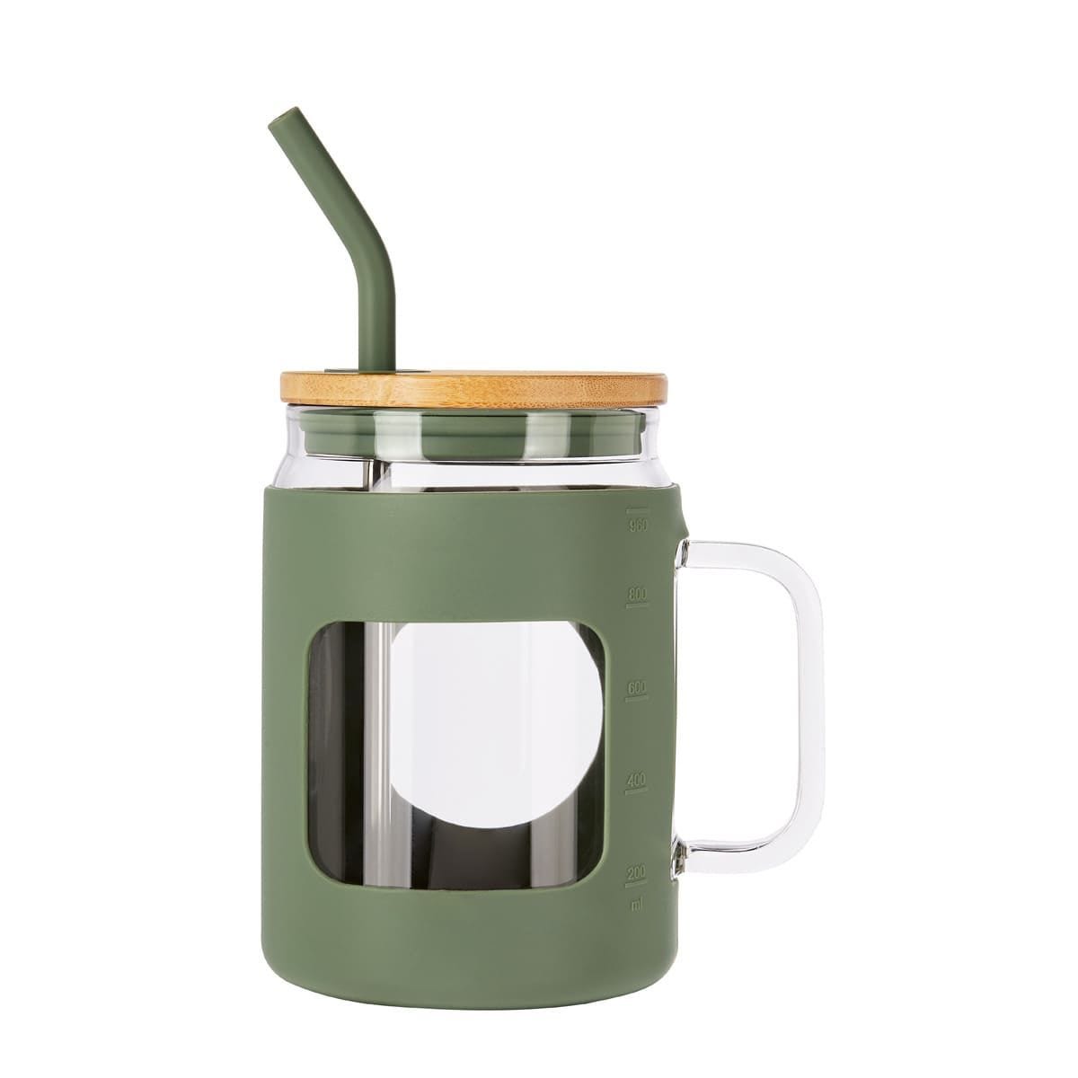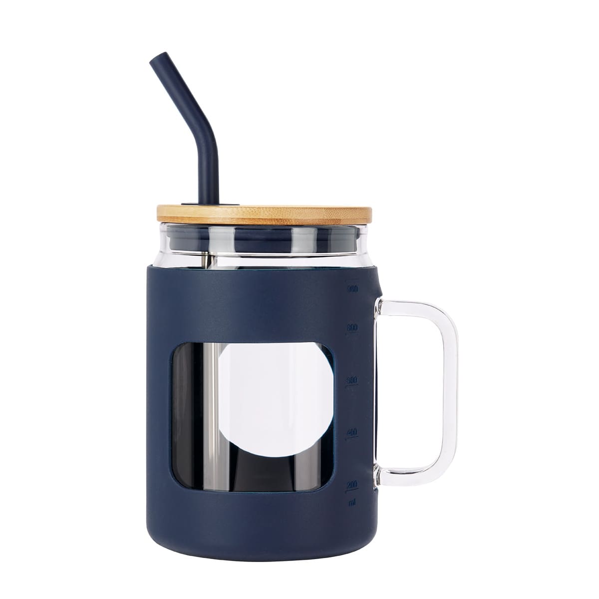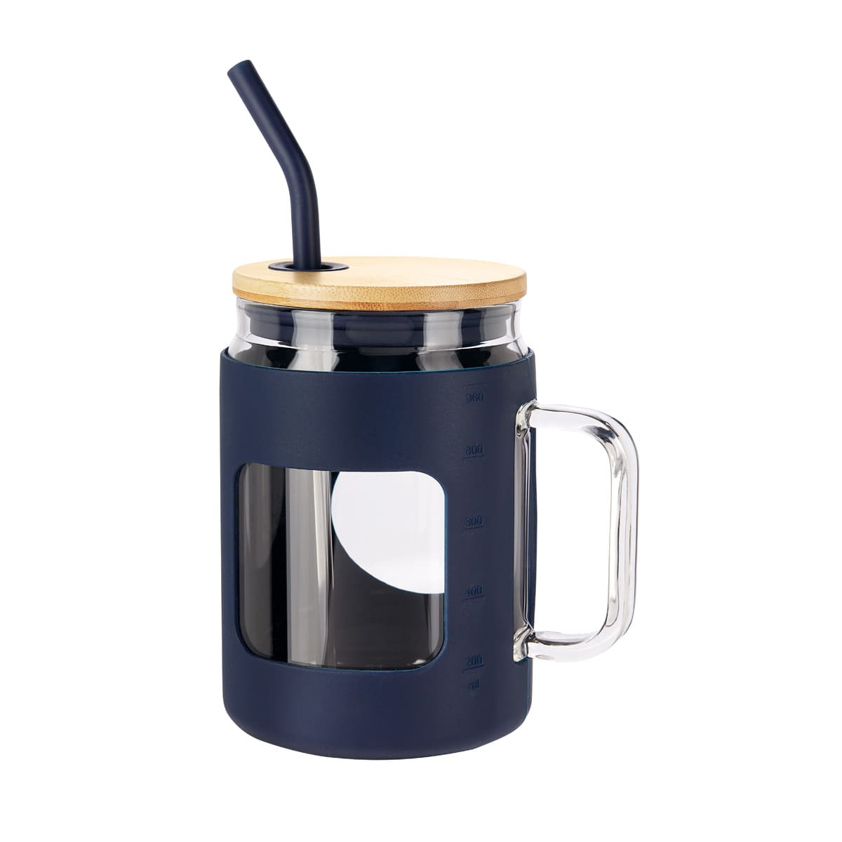 Cilindro de vidrio con asa y manga de silicón graduada en ml. Tapa de bambú con sistema de push y ranura para popote. Incluye popote metálico con boquilla de silicón. Vidrio resistente a bebidas calientes y frías. Caja individual incluida. El bambú es un producto natural el cual puede presentar variaciones en tonalidades y vetas. Este producto por ser últimas piezas puede presentar alguna variación, no se aceptan devoluciones.