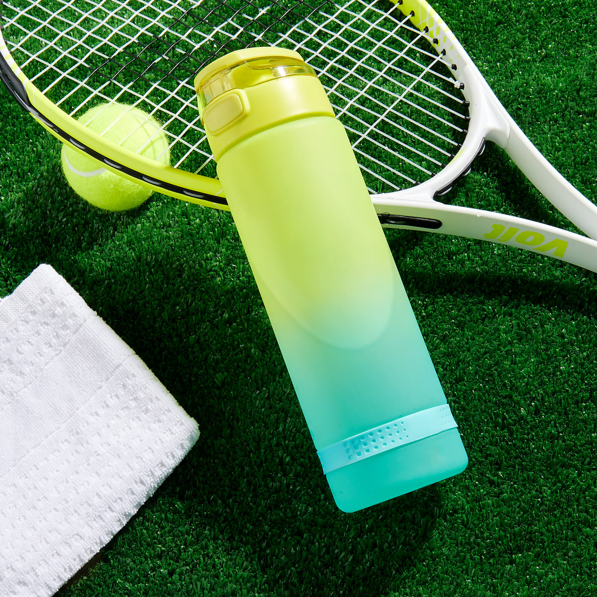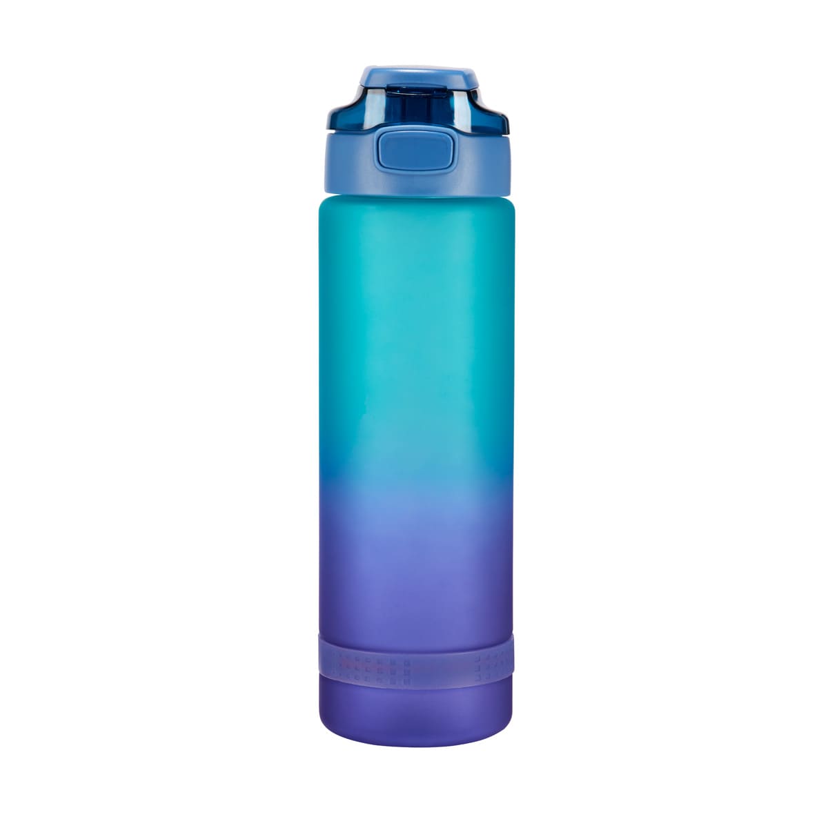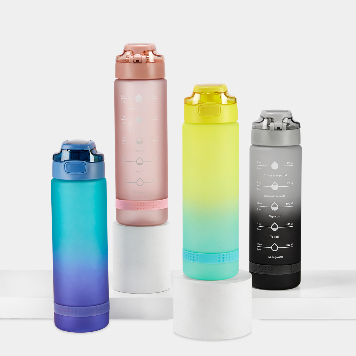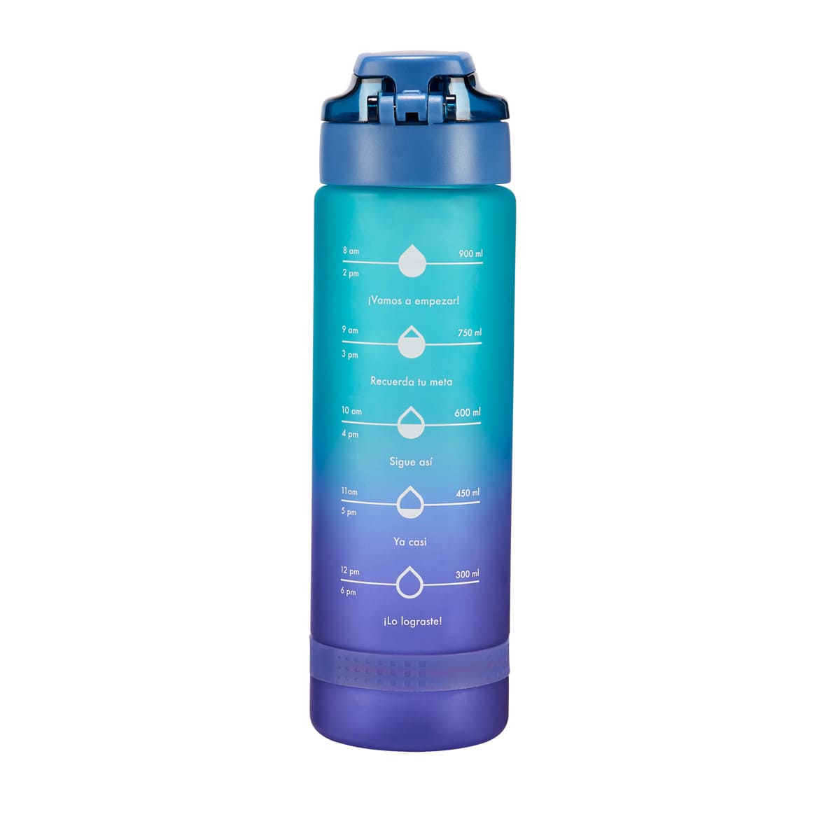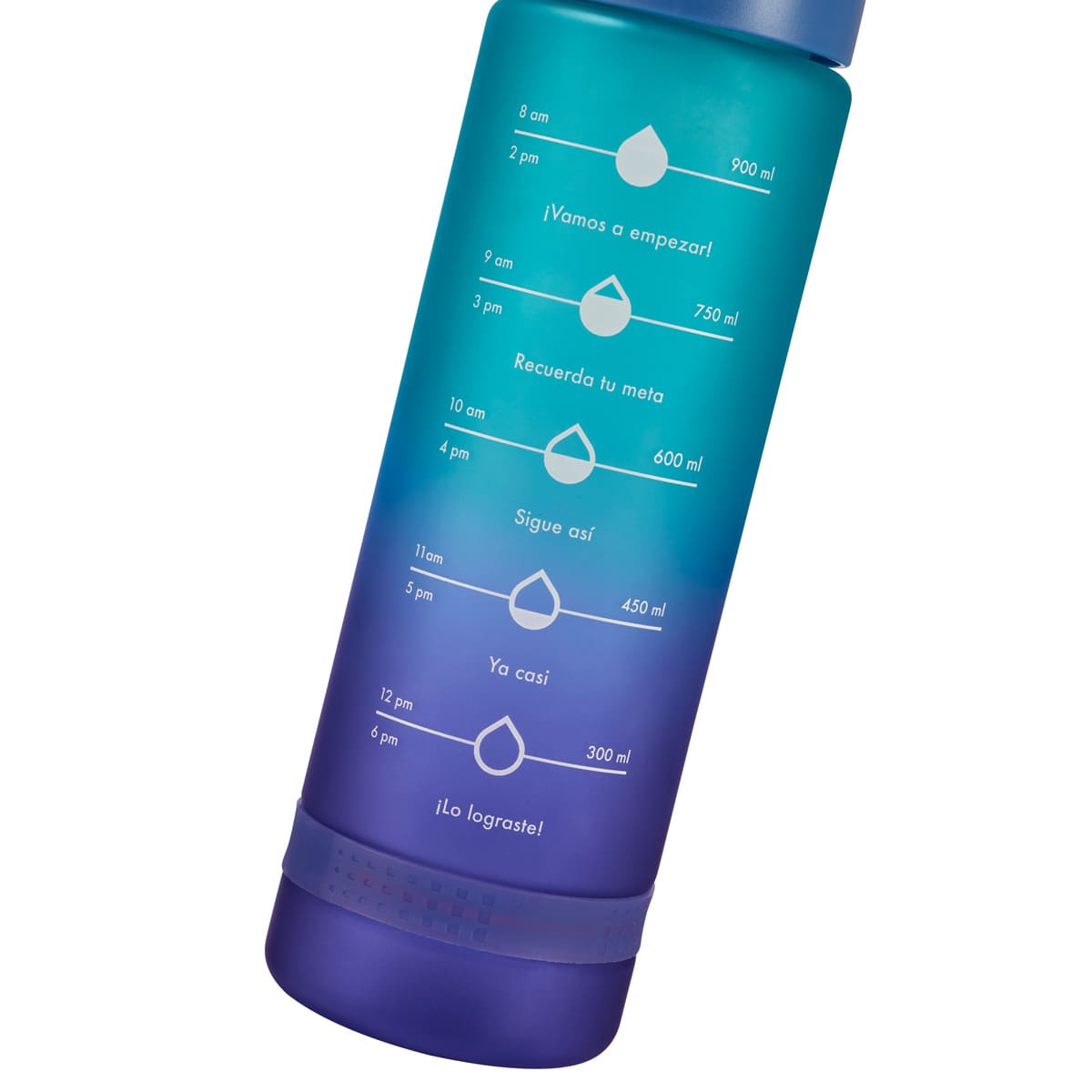 Tapa de plástico con cierre de rosca hermética y boquilla. Sobretapa push con botón y asa plegable. Cuerpo con terminado tipo rubber, suave al tacto. Cuenta con un detalle de silicón en la parte inferior. Incluye marcador de mililitros y horas lo que te permite medir fácilmente la cantidad de agua que bebes a lo largo del día y llevar un control de tu hidratación. Incluye caja individual.