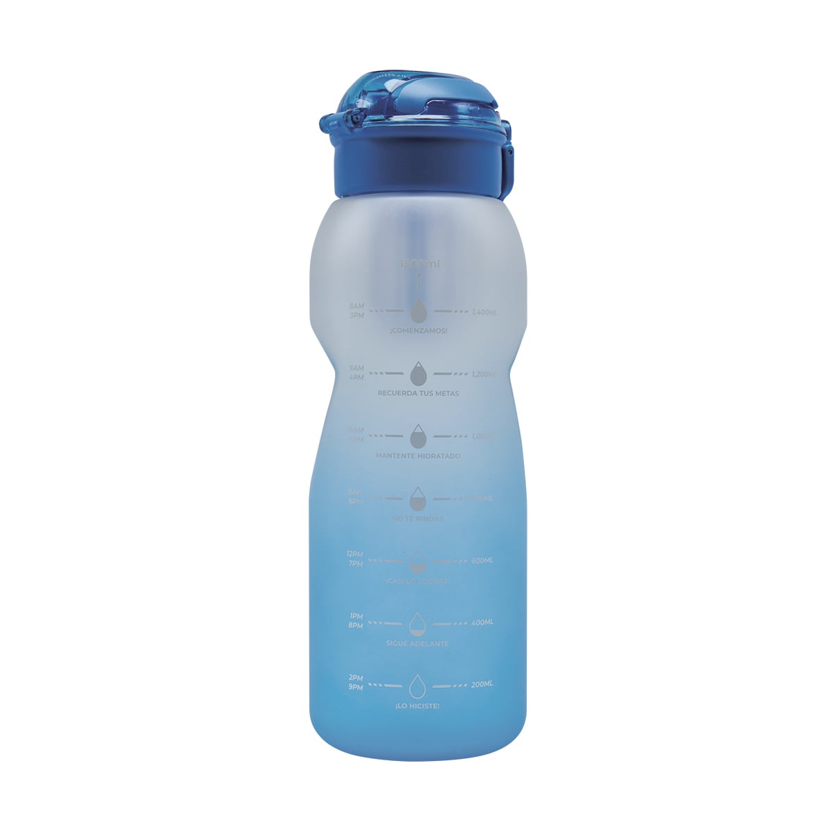 Tapa de plástico con cierre de rosca y boquilla, sobretapa push con botón de seguridad y asa plegable. Cuerpo con terminado rubber, resaques laterales para un mejor agarre, indicador de mililitros y horas para motivar y controlar tus hábitos de hidratación. Incluye filtro de plástico y caja individual.