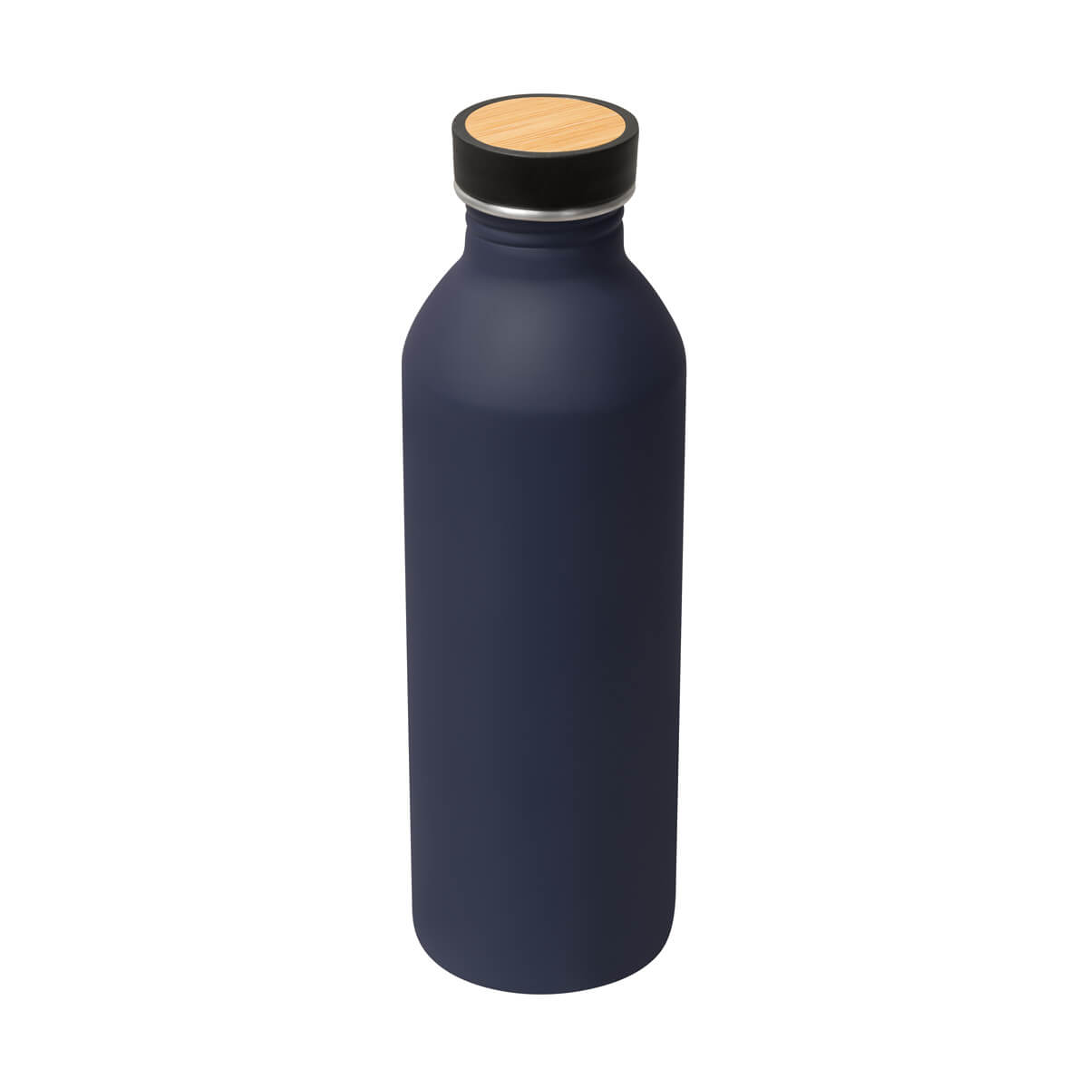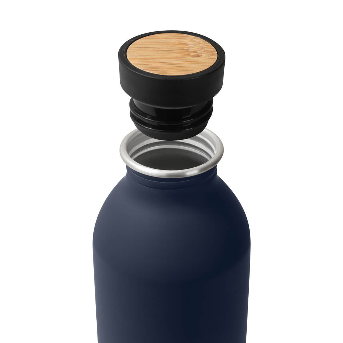 Cilindro metálico de una pared. Tapa de plástico y bambú, su sistema de rosca, permite cerrarlo facilmente y prevenir derrames. Su cuerpo en terminado mate le agrega un toque elegante. El bambú es un producto natural el cual puede presentar variaciones en tonalidades y vetas. Capacidad de 18 Oz. Incluye caja individual.