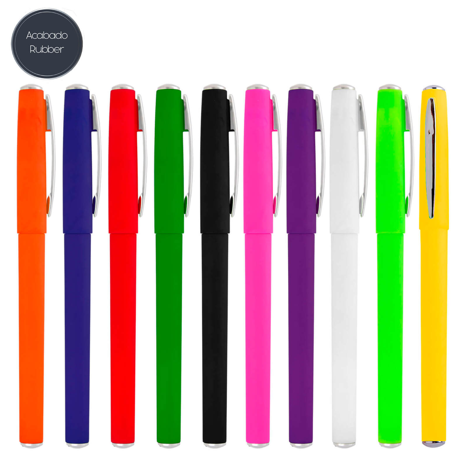 Bolígrafo con acabado rubber, tinta de gel y clip metálico.