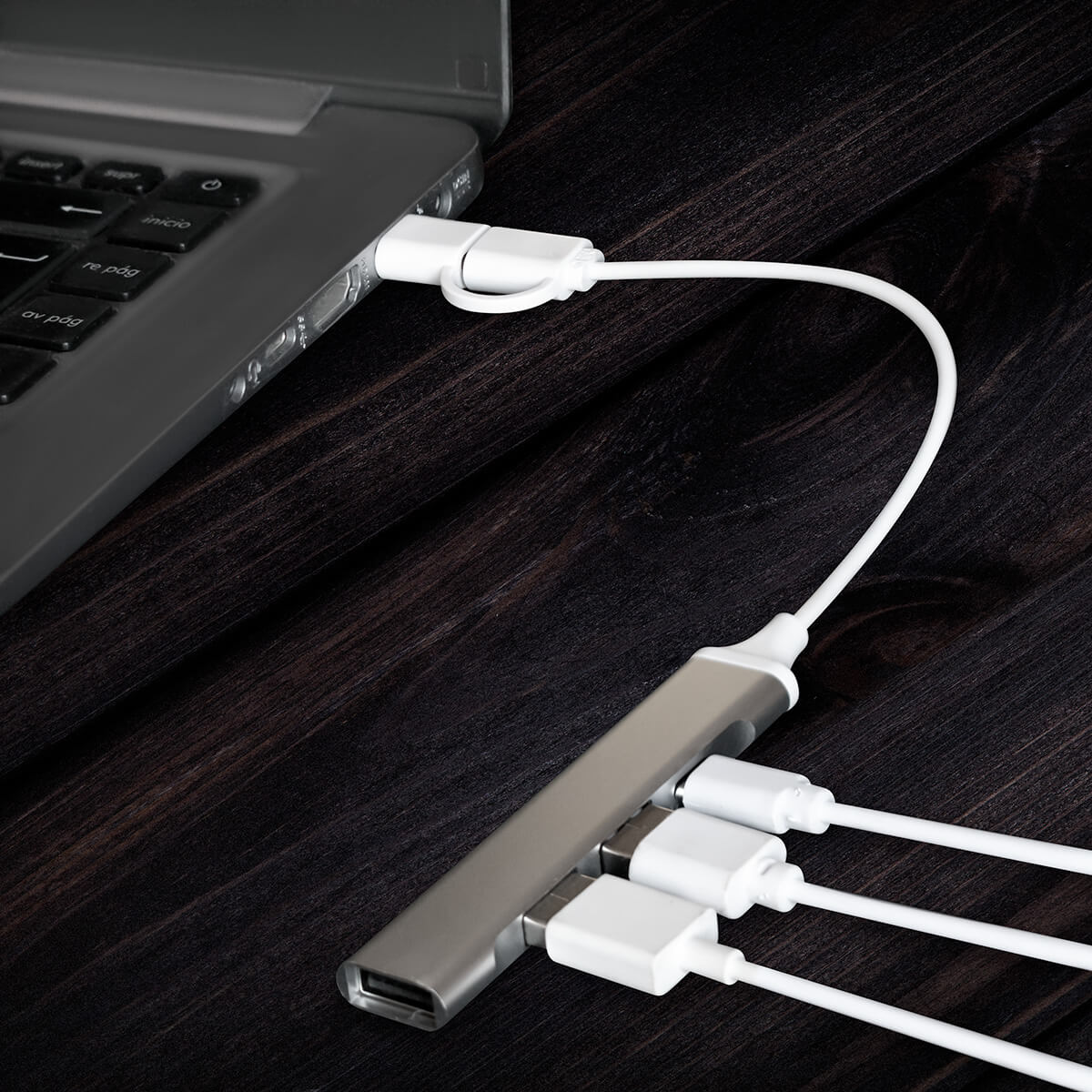 Concentrador acabado metálico con 3 puertos USB y 1 puerto tipo C. Soporta transferencia de datos. Cable de conexión con USB y tipo C.