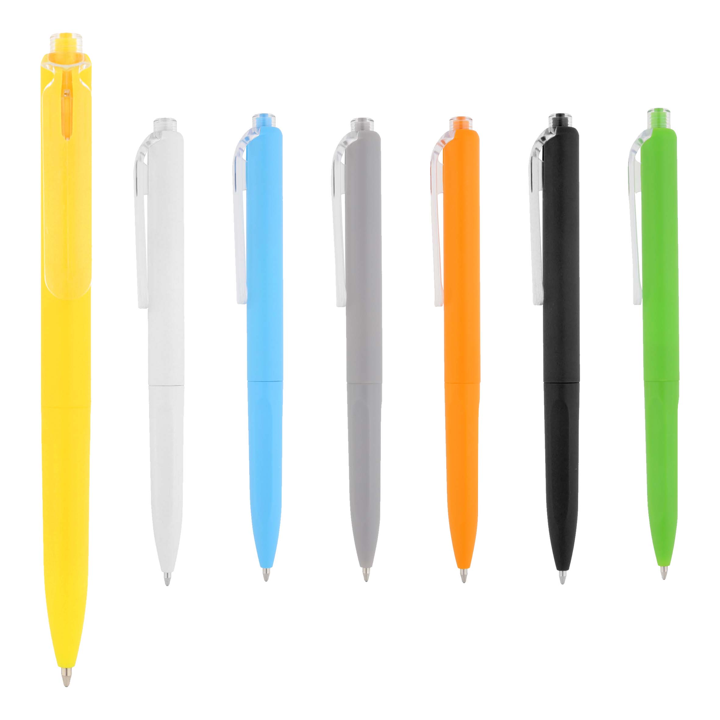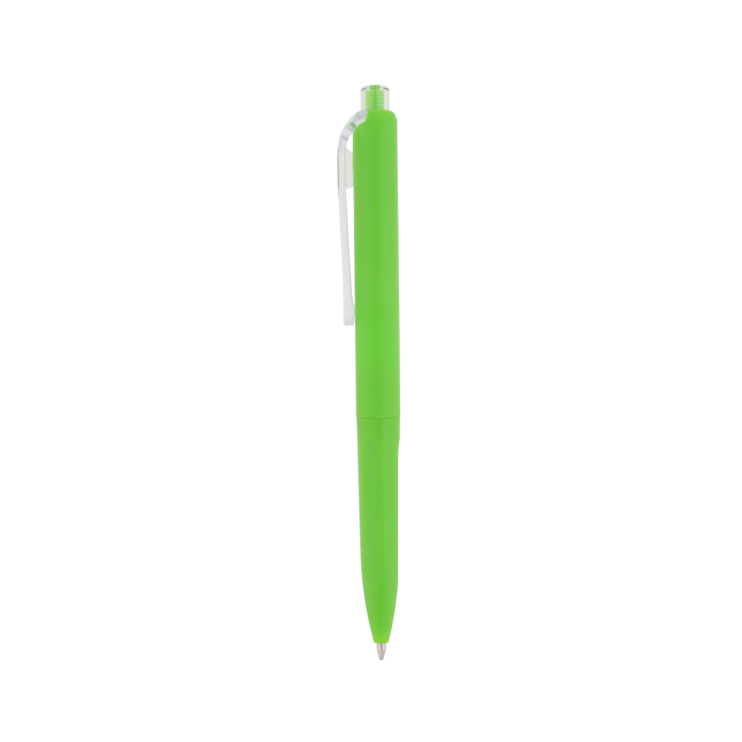 Bolígrafo de plástico con clip transparente y mecanismo de click.