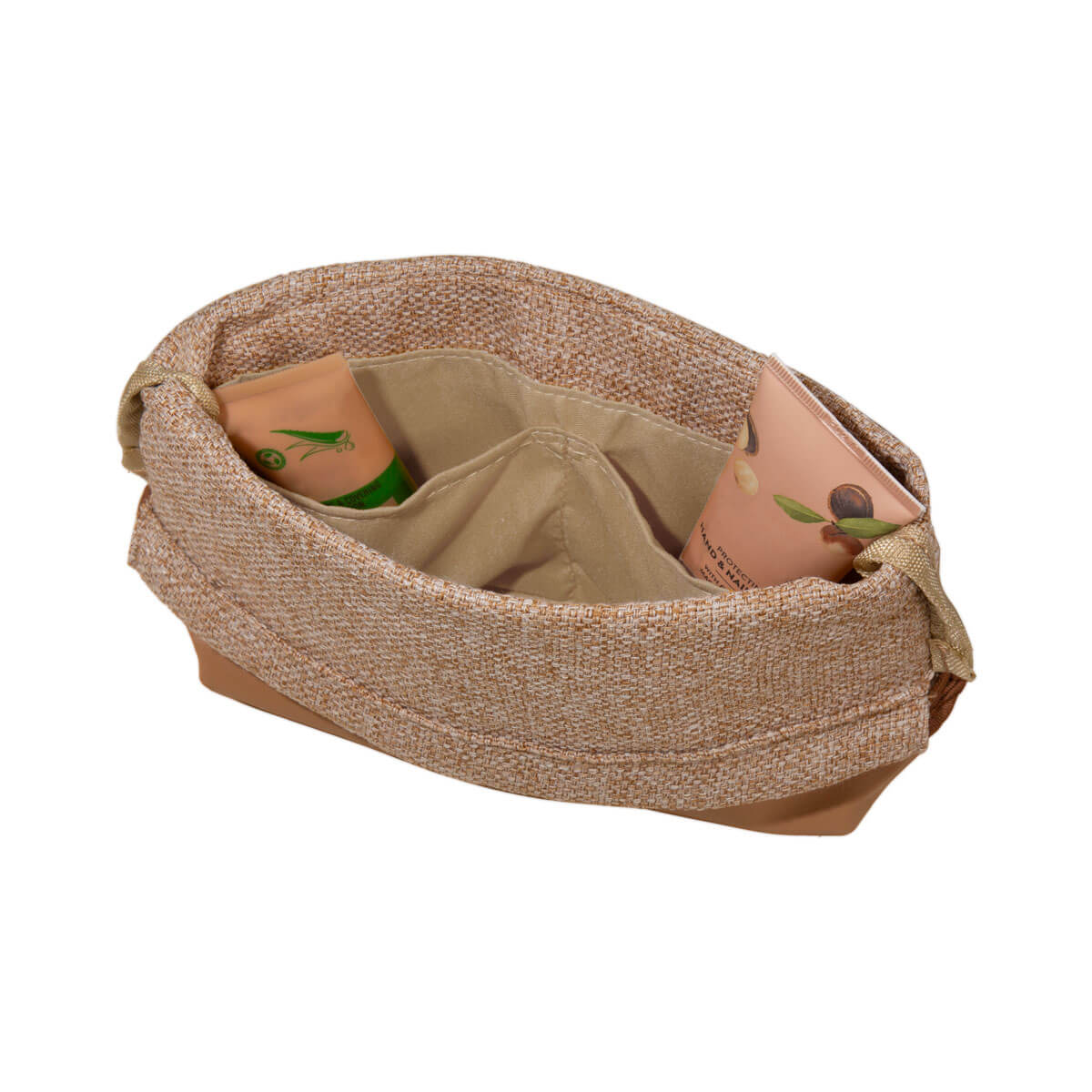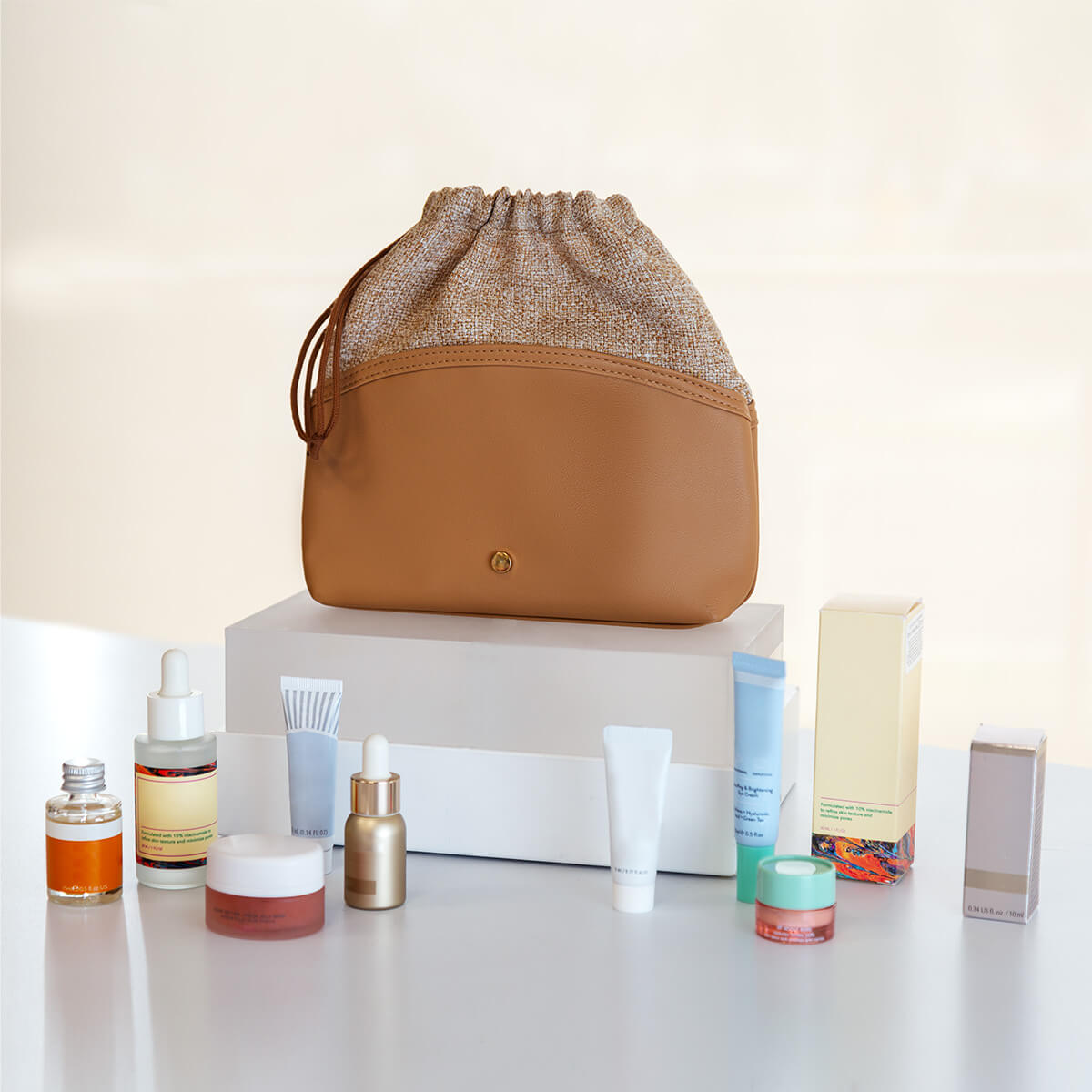 Cosmetiquera versátil con cierre con jareta. En su compartimento principal encontrarás dos prácticos bolsillos organizadores para mantener tus productos de belleza en orden.