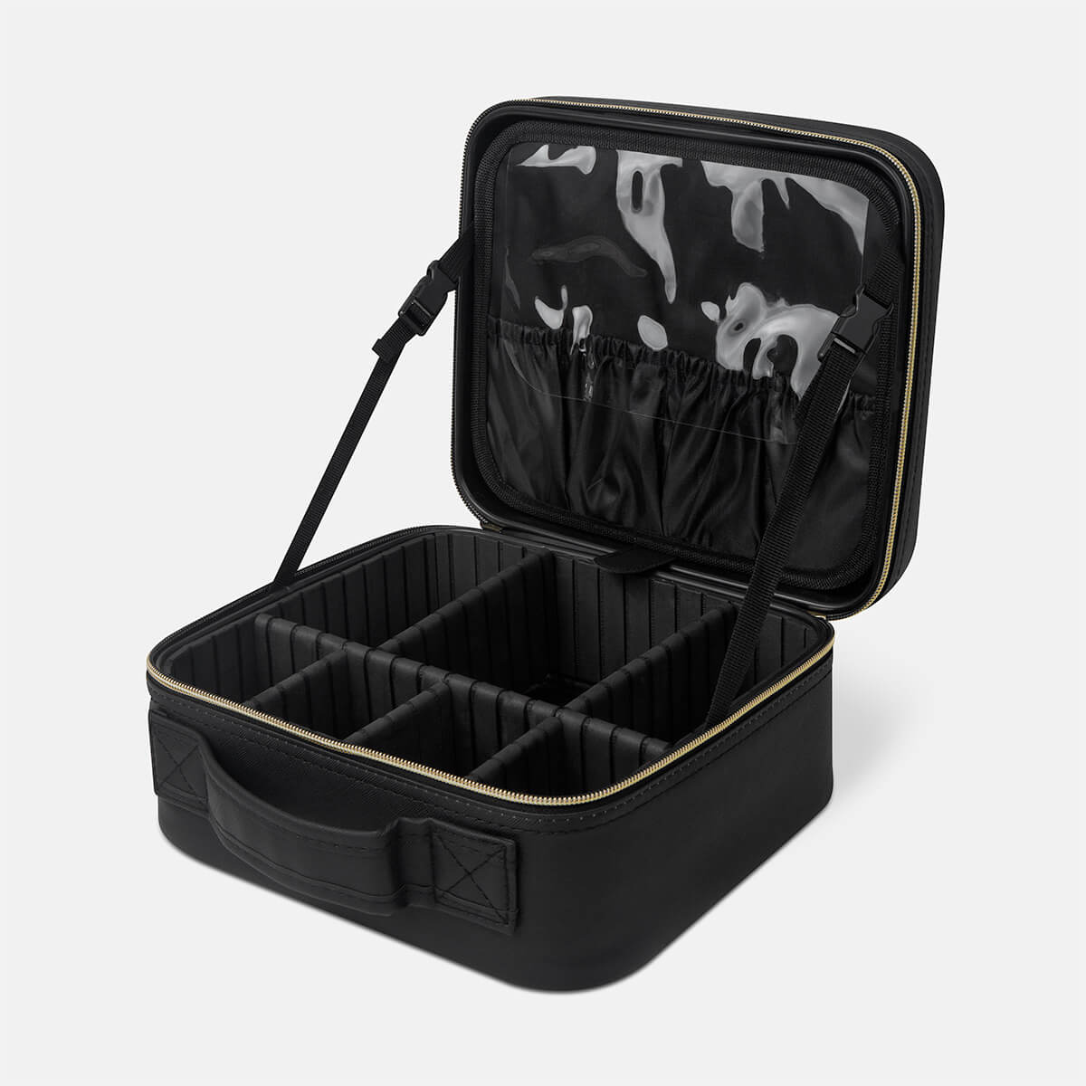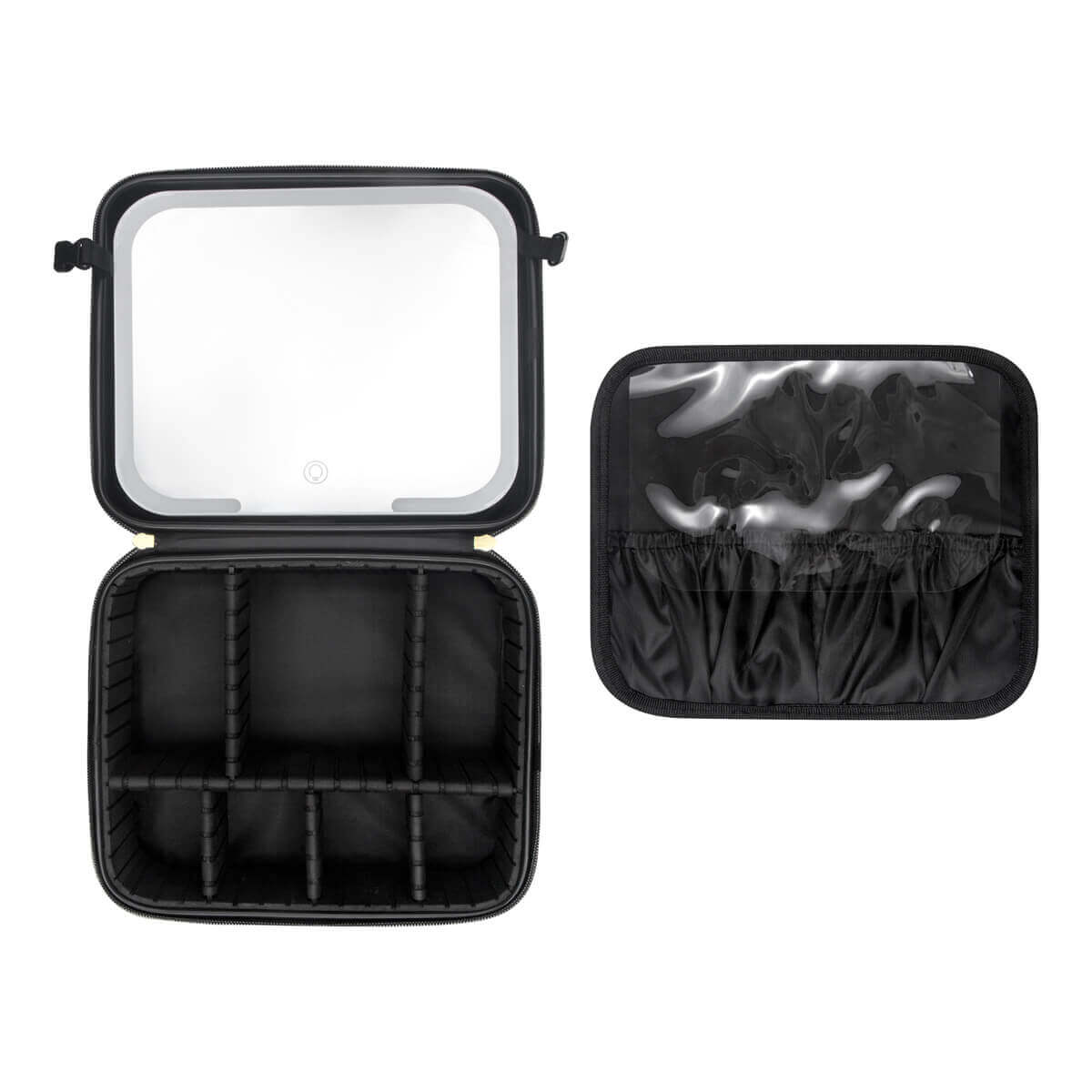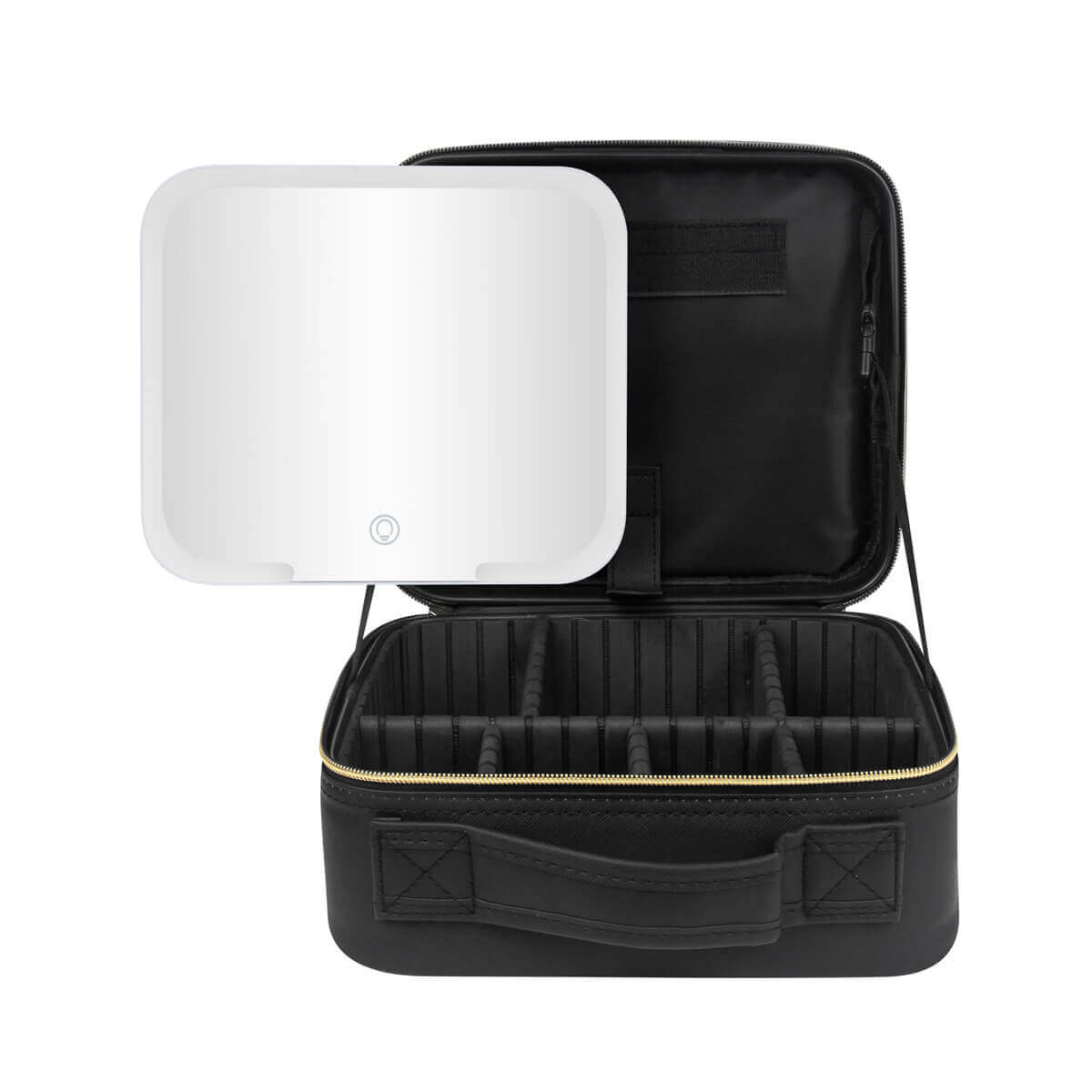 Organizador de maquillaje y brochas. En su interior contiene un amplio espejo de iluminación LED con 3 modos de luz: fría, natural y cálida, las cuales cambian pulsando el botón del sensor táctil one touch. Duración de luz 2 hrs. Puerto de carga tipo C. Incluye cable de carga tipo C.