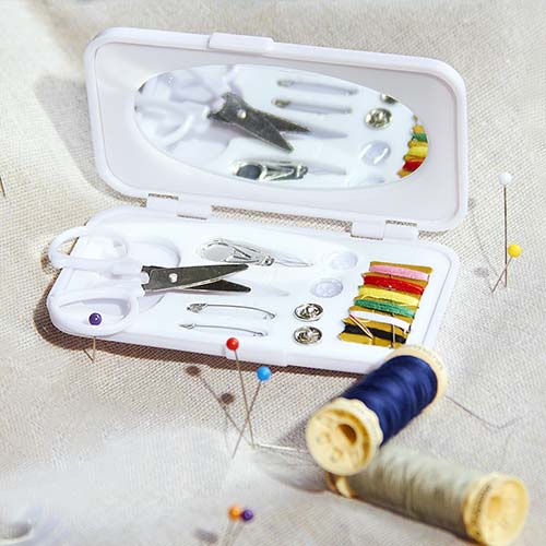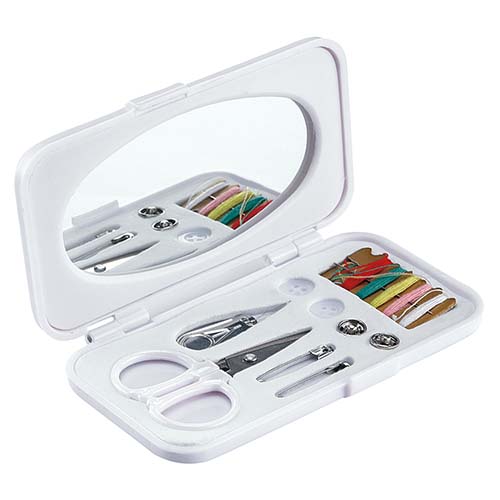Incluye botones, ensartador de aguja, tijeras, hilo, agujas, seguros y estuche con espejo. Este producto por ser últimas piezas puede presentar alguna variación, no se aceptan devoluciones.