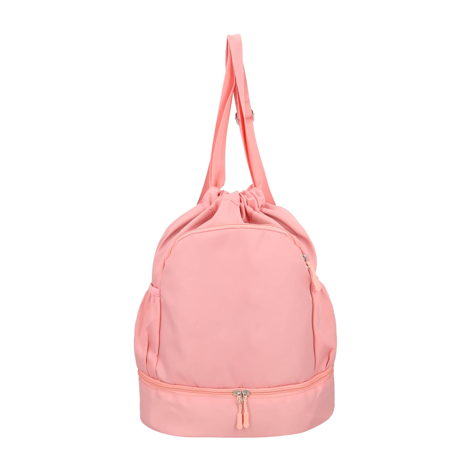 Morral de poliéster con 1 compartimento principal, 1 compartimento frontal, 1 compartimento trasero, bolsas laterales, zapatera y correas ajustables.