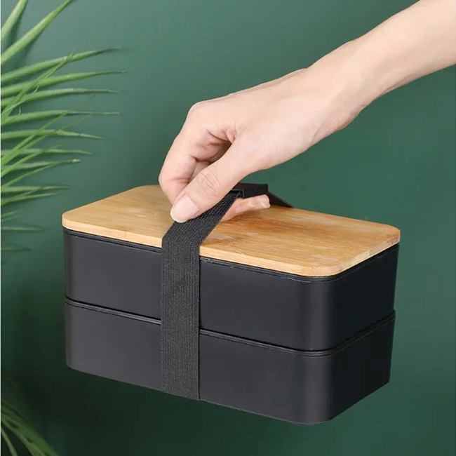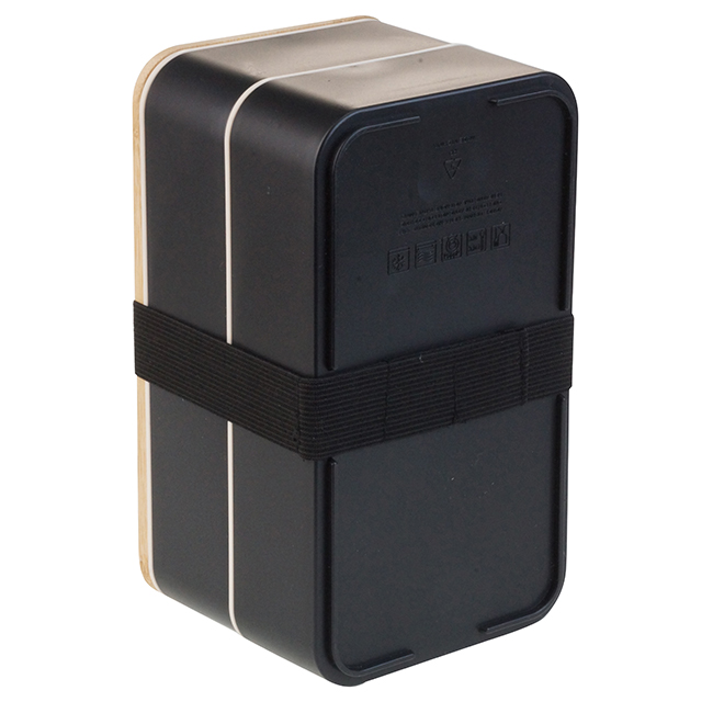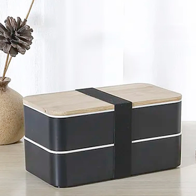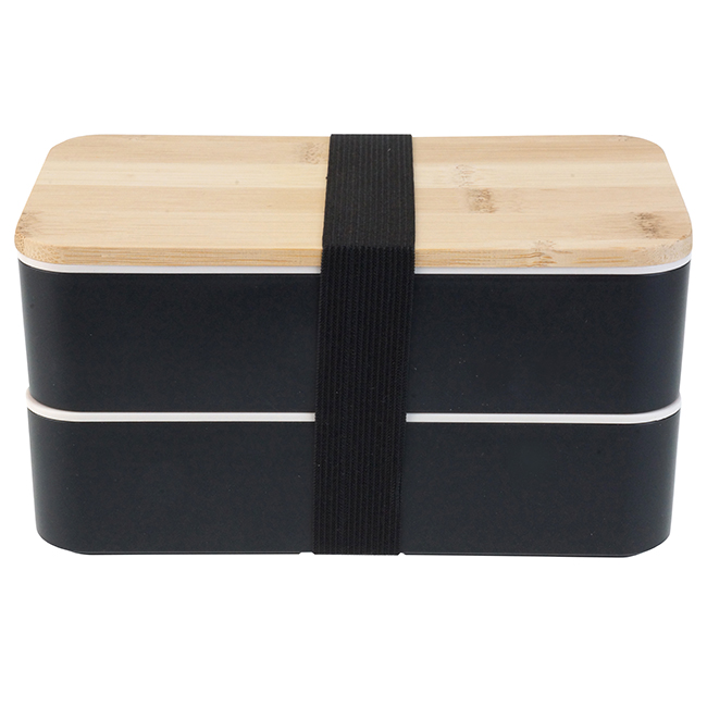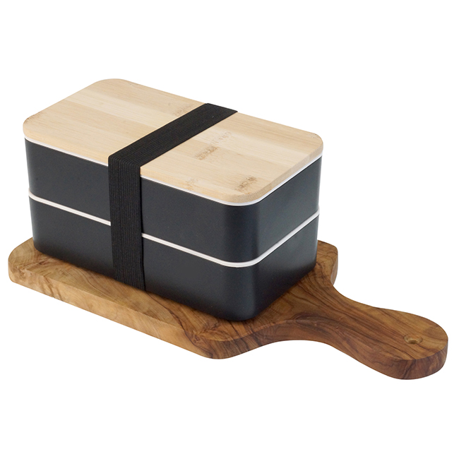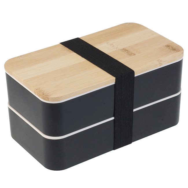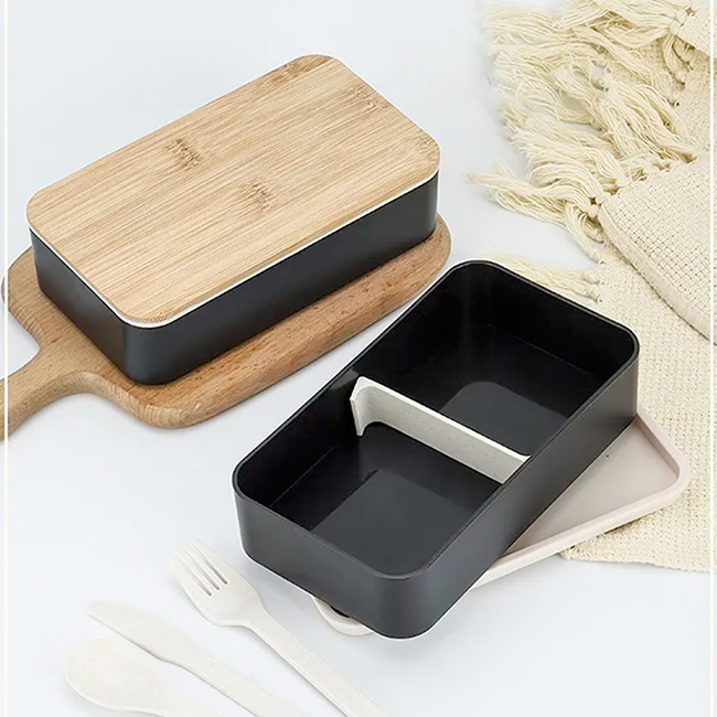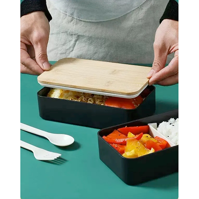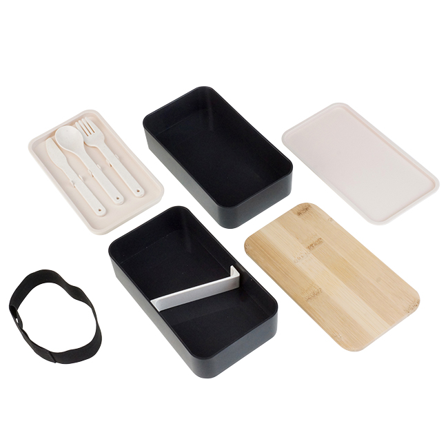 Tapa de bamboo. Puede introducirse en microondas. Barra divisoria movible. Tapa intermedia con juego de cubiertos: cuchara, tenedor, cuchillo.