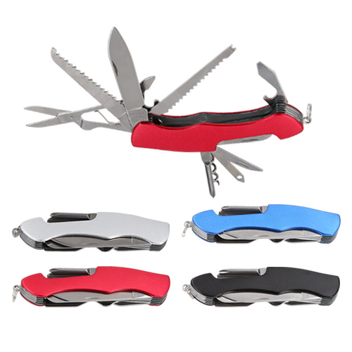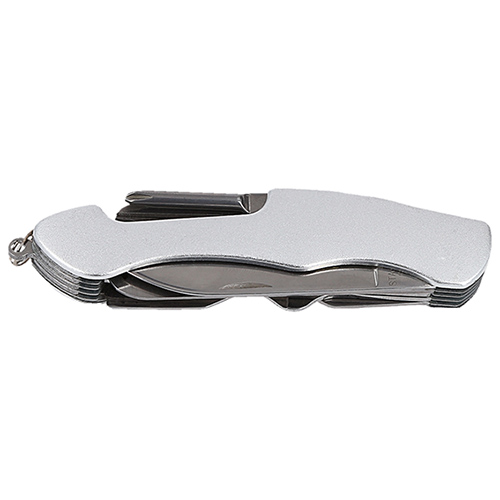Navaja metálica multiusos con 9 funciones: Sierra, destapador, abrelatas, tijeras, serrucho, navaja, sacacorcho, lima y desarmador.