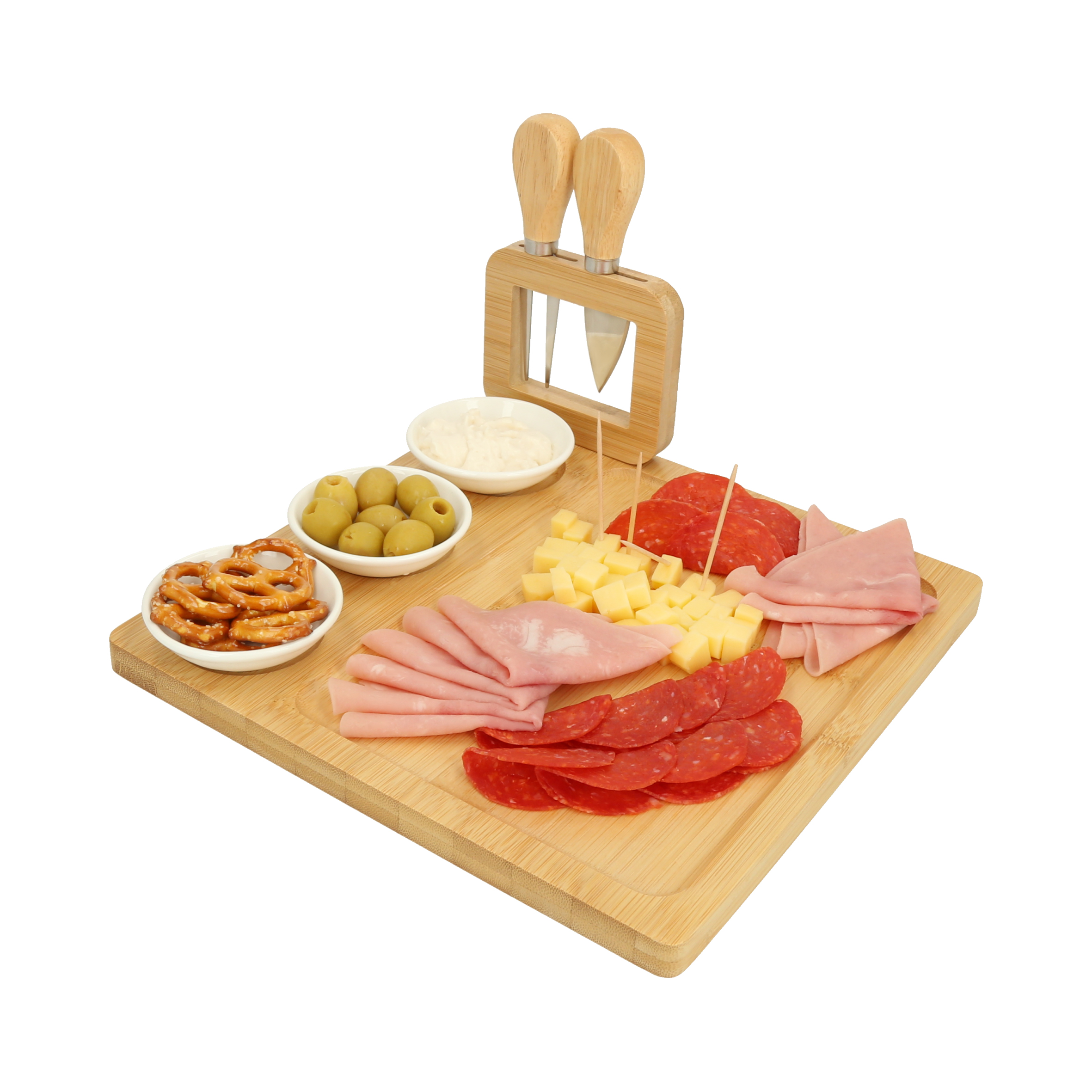 Tabla de quesos que incluye 3 mini platos de cerámica, un tenedor para quesos y un cuchillo.