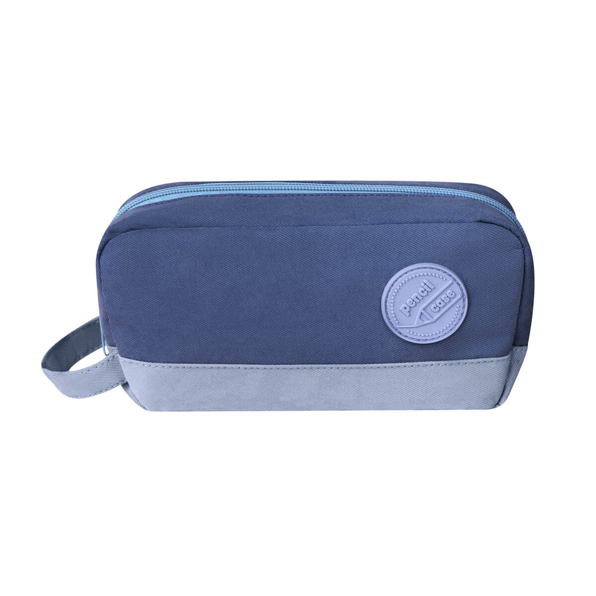 Estuche escolar bitono con asa para sujetar fácilmente. Incluye cierre en el compartimento principal, amplio espacio para artículos escolares y un parche decorativo de silicón.